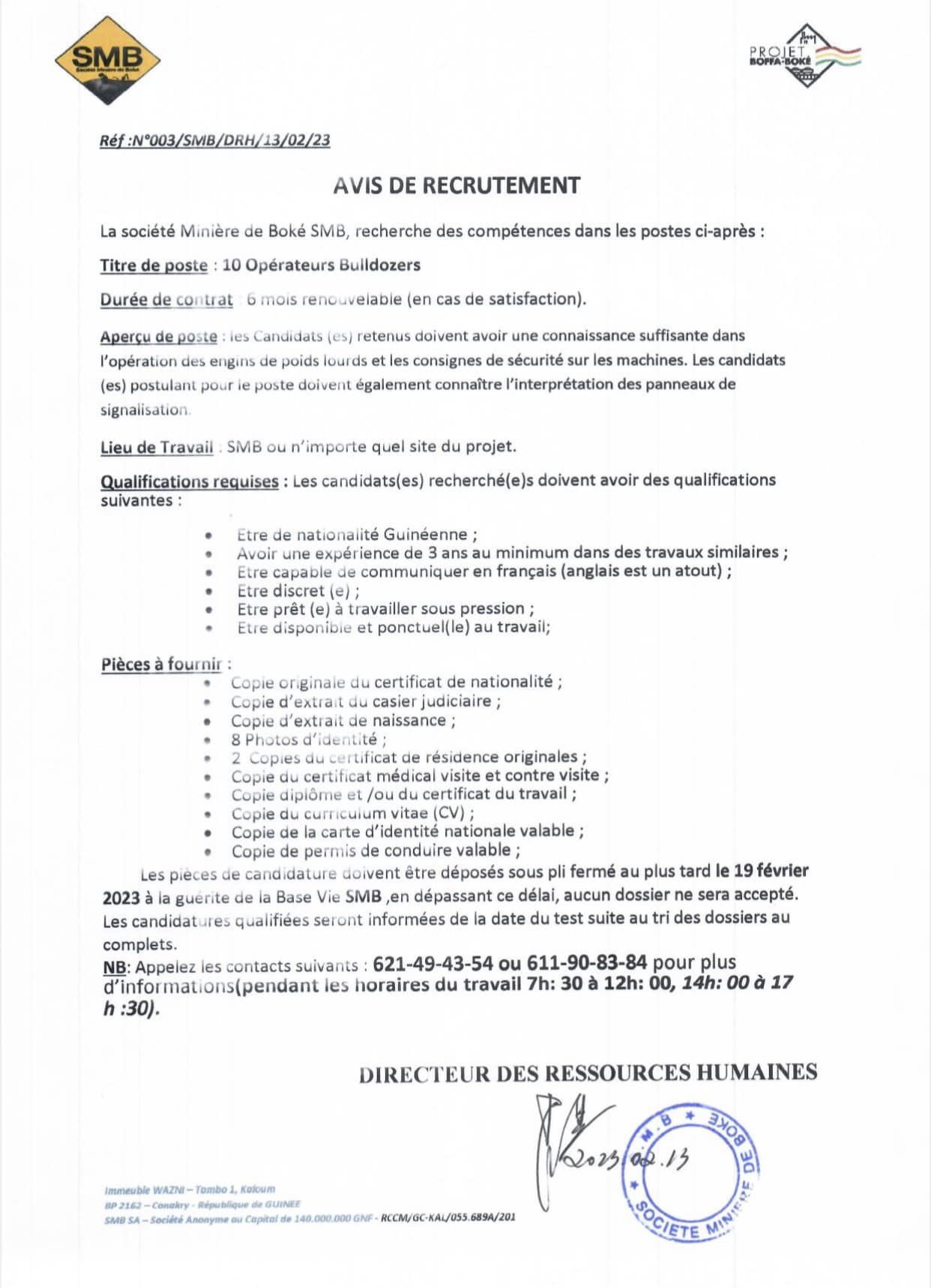 Offre d’emploi : la Société Minière de Boké recherche 10 Opérateurs Buildozers Offres d'emploi By alphaleserum@gmail.com On Fév 15, 2023 Share Share