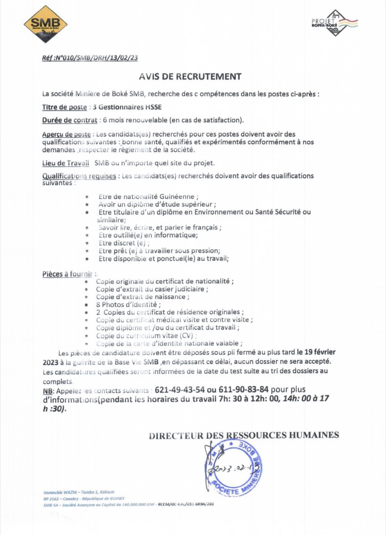 Offre d’emploi : la Société Minière de Boké recherche 3 Gestionnaires HSSE Offres d'emploi By alphaleserum@gmail.com On Fév 15, 2023 Share Share