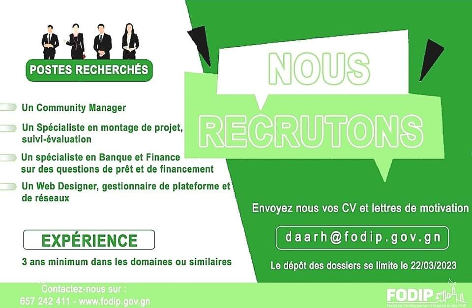 La Direction Générale du Fonds de Développement Industriel et des PME (FODIP) recrute les Postes suivants :