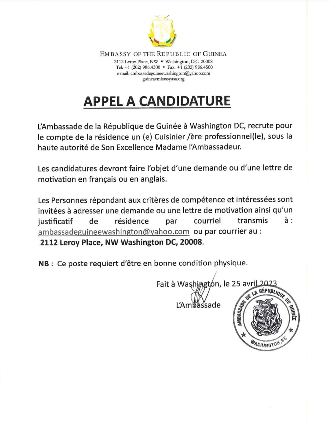 Offre d’emploi : l’Ambassade de la République de Guinée à Washington – DC recrute un(e) Cuisinier/ère professionnel(le) Offres d'emploi By alphaleserum@gmail.com On Avr 26, 2023 Share Share