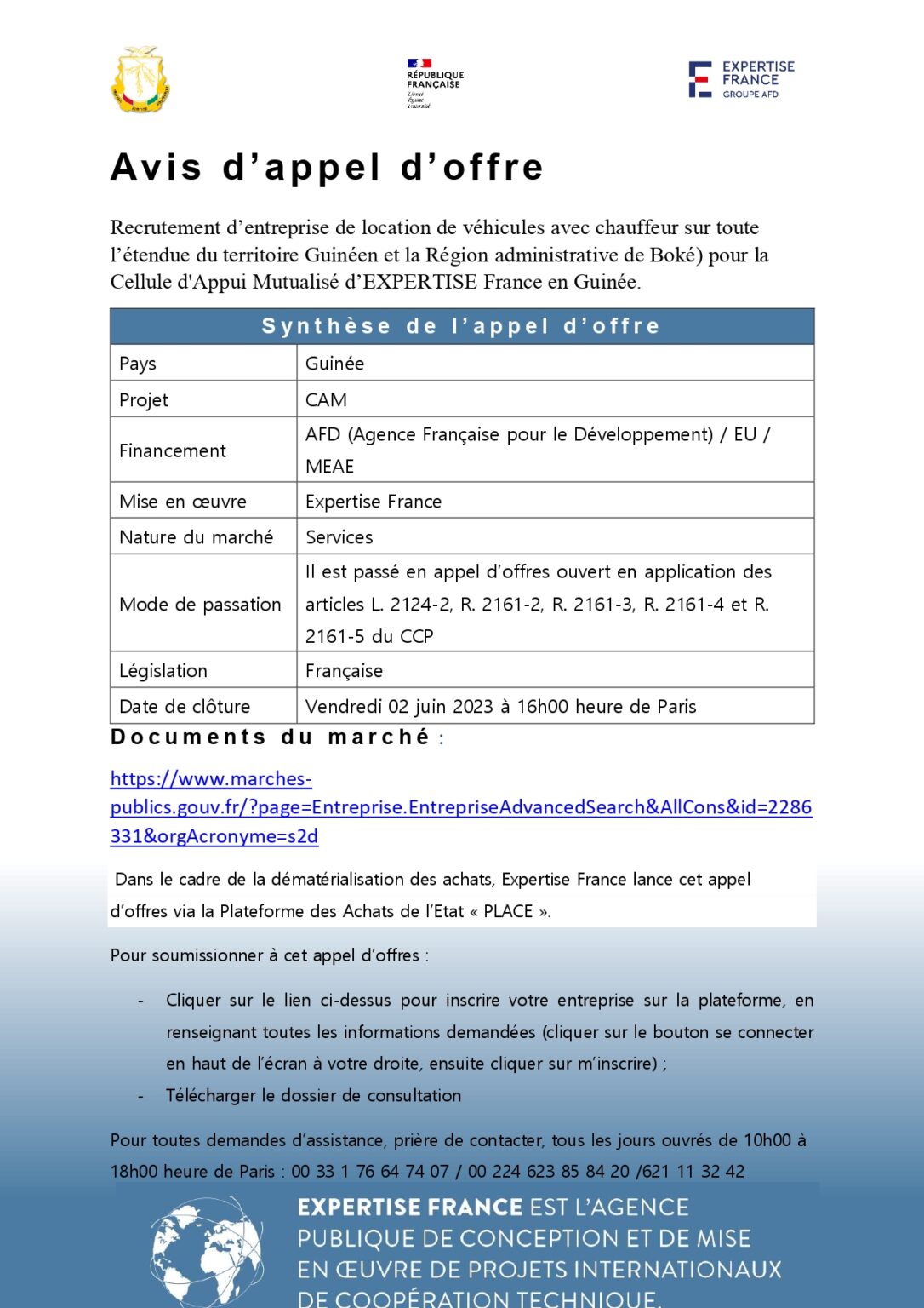 Appel d’offre : Expertise France recherche une entreprise de location de véhicules avec chauffeur Appels d'offre By alphaleserum@gmail.com On Avr 30, 2023 Share Document intégral de l’appel : https://www.marches-publics.gouv.fr/?page=Entreprise.EntrepriseAdvancedSearch&AllCons&id=2286331&orgAcronyme=s2d Share