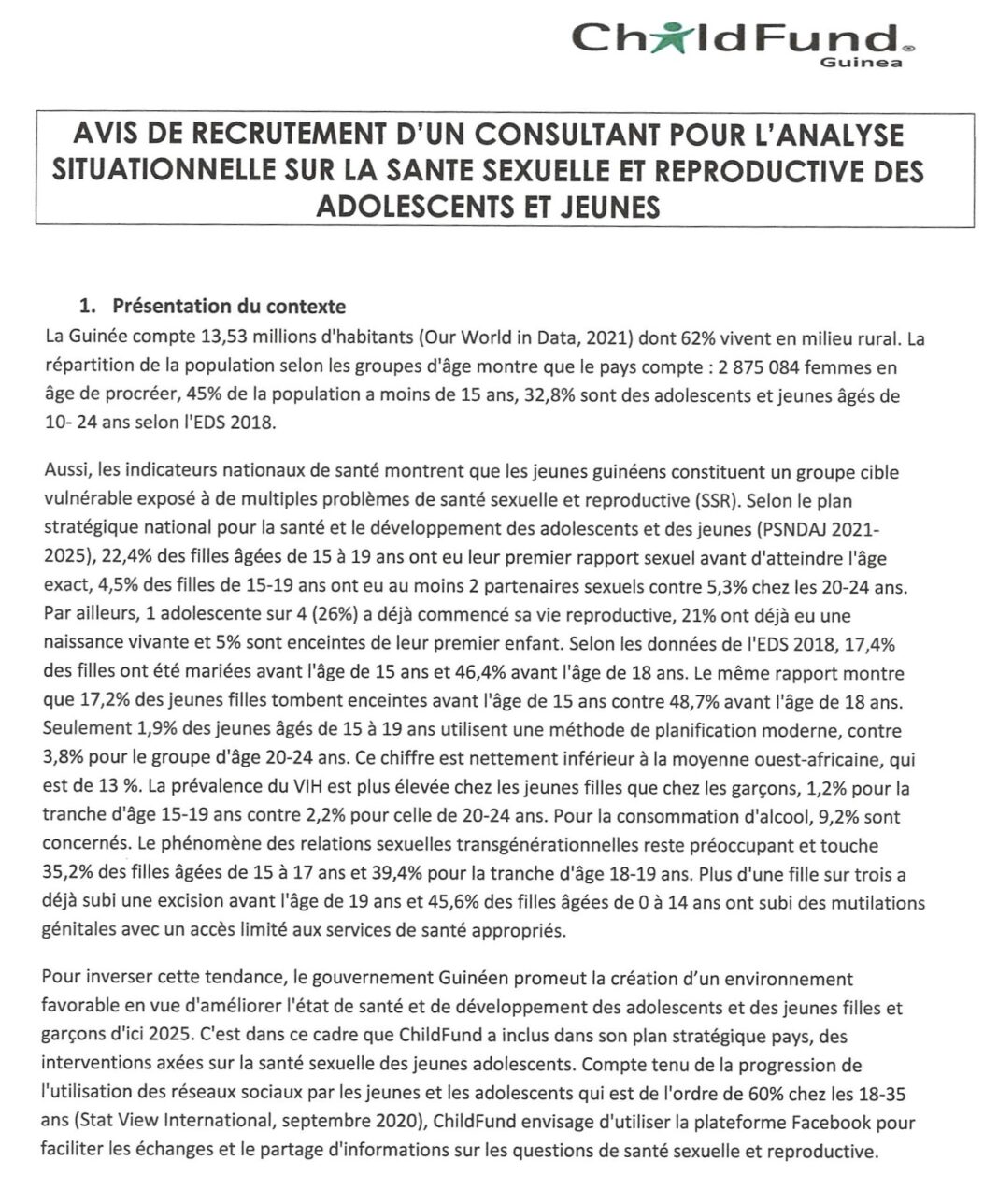 Offre d’emploi : Child Found recrute un Consultant pour l’analyse Situationnelle sur la Sante Sexuelle et Reproductive des Adolescents et Jeunes