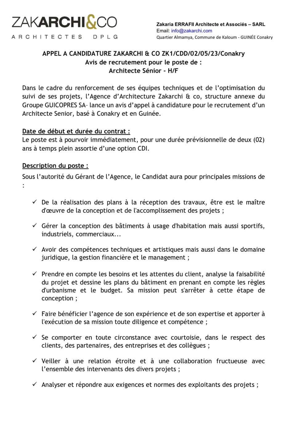 Dans le cadre du renforcement de ses équipes techniques et de l’optimisation du suivi de ses projets, l’Agence d’Architecture Zakarchi & co, structure annexe du Groupe GUICOPRES SA- lance un avis d’appel à candidature pour le recrutement d’un Architecte Senior, basé à Conakry et en Guinée.