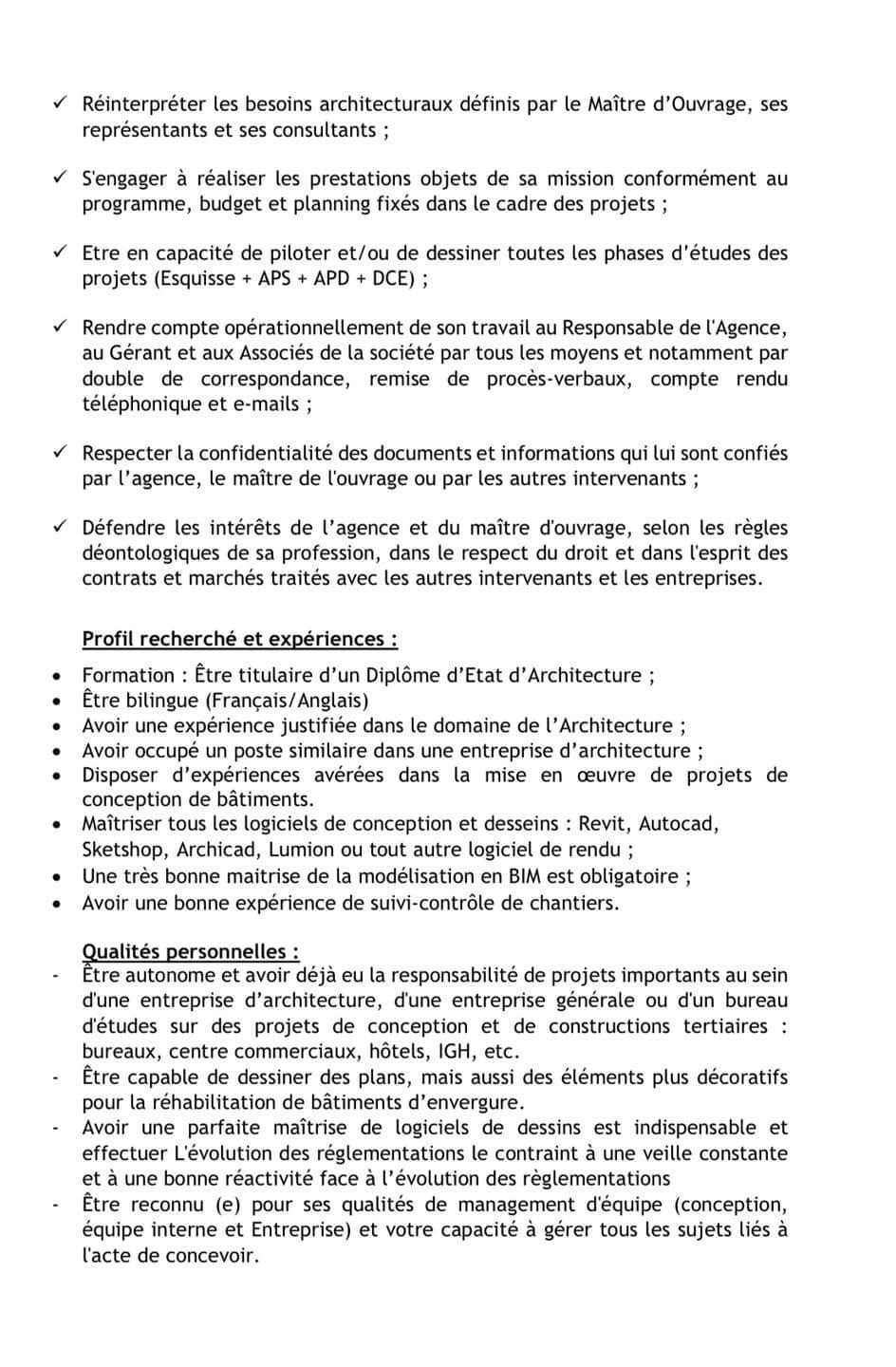 Etre autonome et avoir déjà eu la responsabilité de projets importants au sein d’une entreprise d’architecture, d’une entreprise générale ou d’un bureau d’études sur des projets de conception et de constructions tertiaires :
