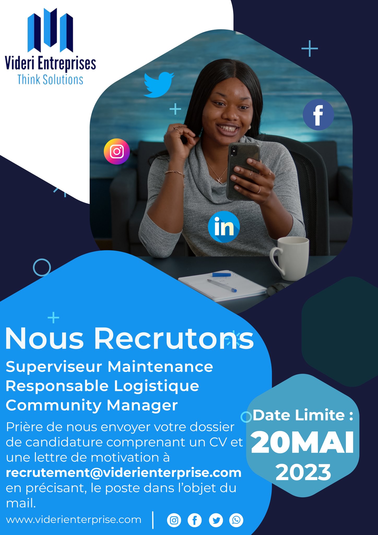 Le dossier de candidature composé d’une lettre de motivation et un curriculum vitae (CV) est à envoyer à la Direction des Ressources Humaines au plus tard le 17 Mai 2023 à 17h :00mn à l’adresse électronique ci-après : recrutement@viderienterprise.com