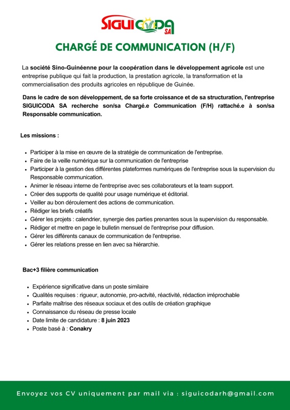 Offre d’emploi : la SIGUICODA recrute un(e) Chargé(e) de communication Offres d'emploi By alphaleserum@gmail.com On Juin 1, 2023 Share Share