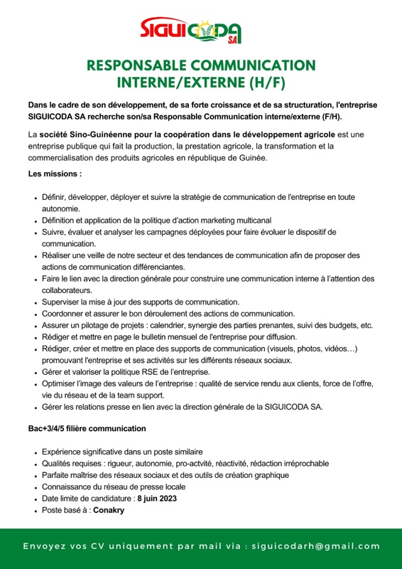 Offre d’emploi : la SIGUICODA recrute un(e) Responsable de communication Non classé By alphaleserum@gmail.com On Juin 1, 2023 Share Share