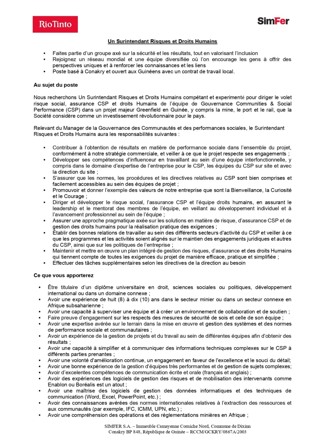 Offre d’emploi : Rio Tinto recrute un Surintendant Risques et Droits Humains Offres d'emploi By alphaleserum@gmail.com On Juin 9, 2023 Share Posez votre candidature dès aujourd’hui : CV + lettre de motivation dans les boites aux lettres de Simfer à Beyla ou en cliquant sur le lien suivant : https://riotinto.csod.com/ux/ats/careersite/6/home/requisition/85948?c=riotinto Share