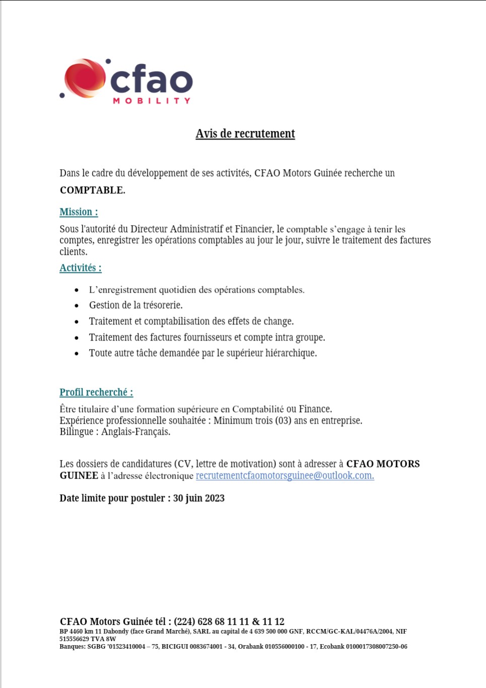 Offre d’emploi : CFAO Motors Guinée recherche un COMPTABLE Offres d'emploi By alphaleserum@gmail.com Last updated Juin 12, 2023 Share Share
