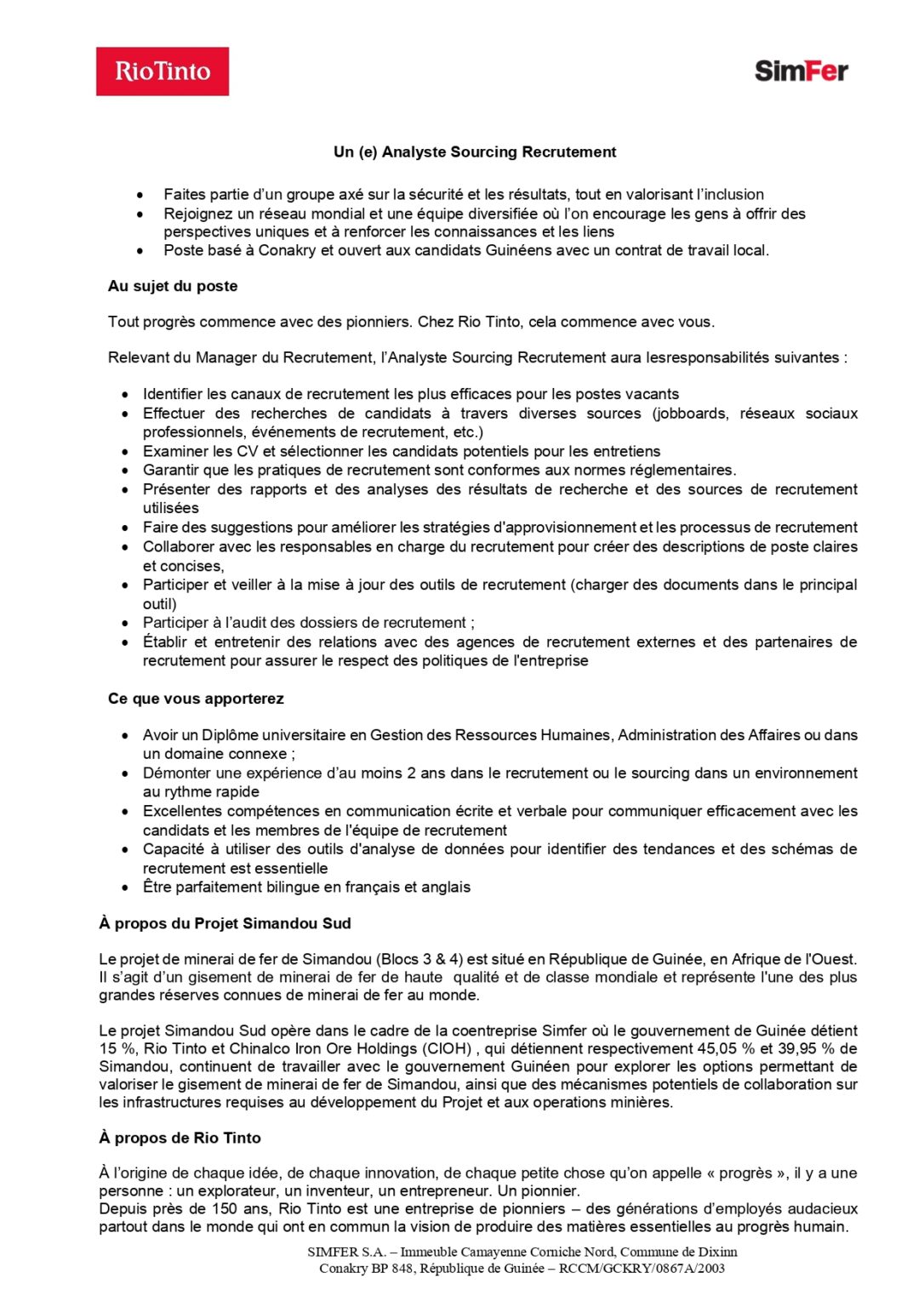 Posez votre candidature dès aujourd’hui : CV + lettre de motivation dans les boites aux lettres de Simfer à Beyla ou en cliquant sur le lien ci-dessous :