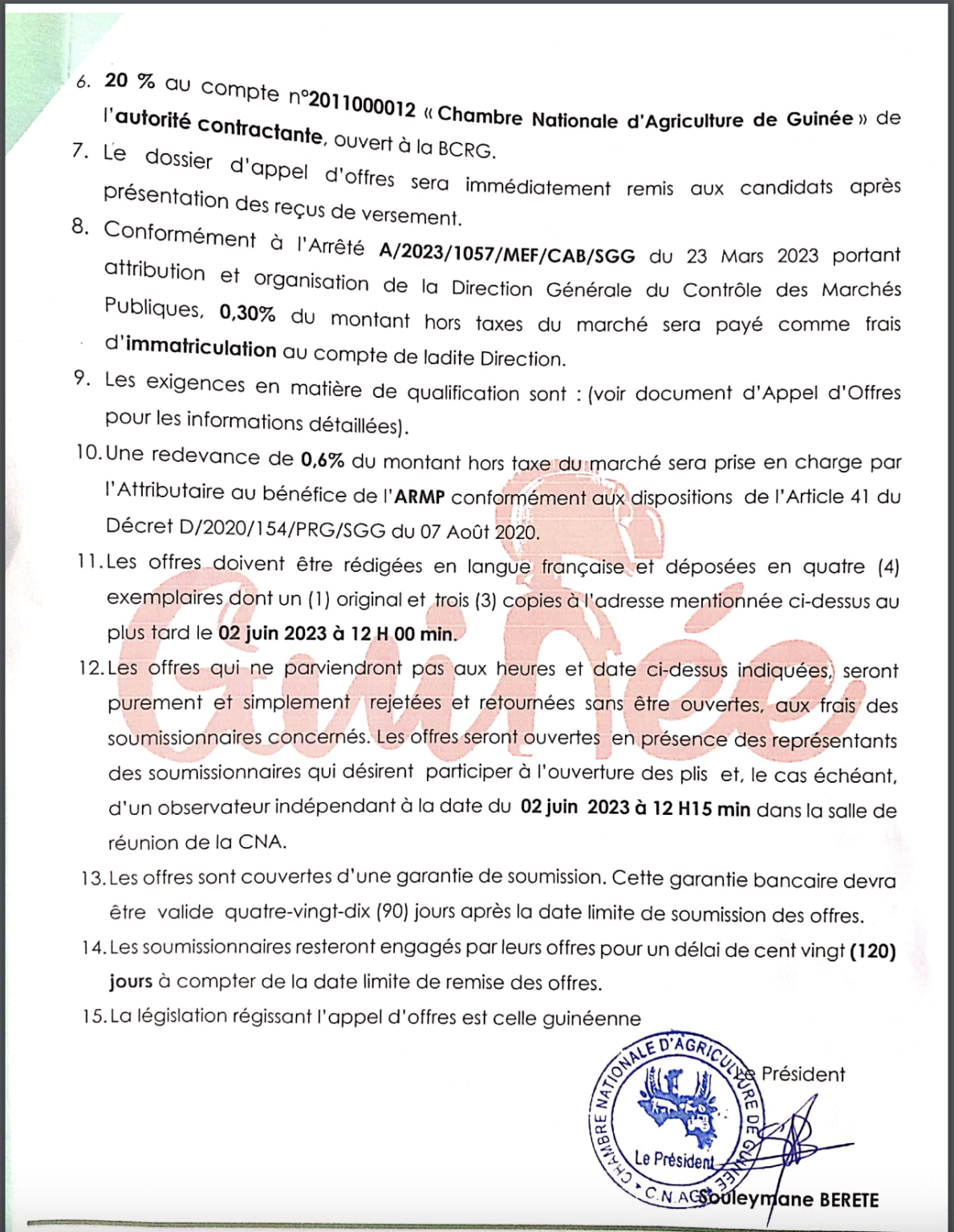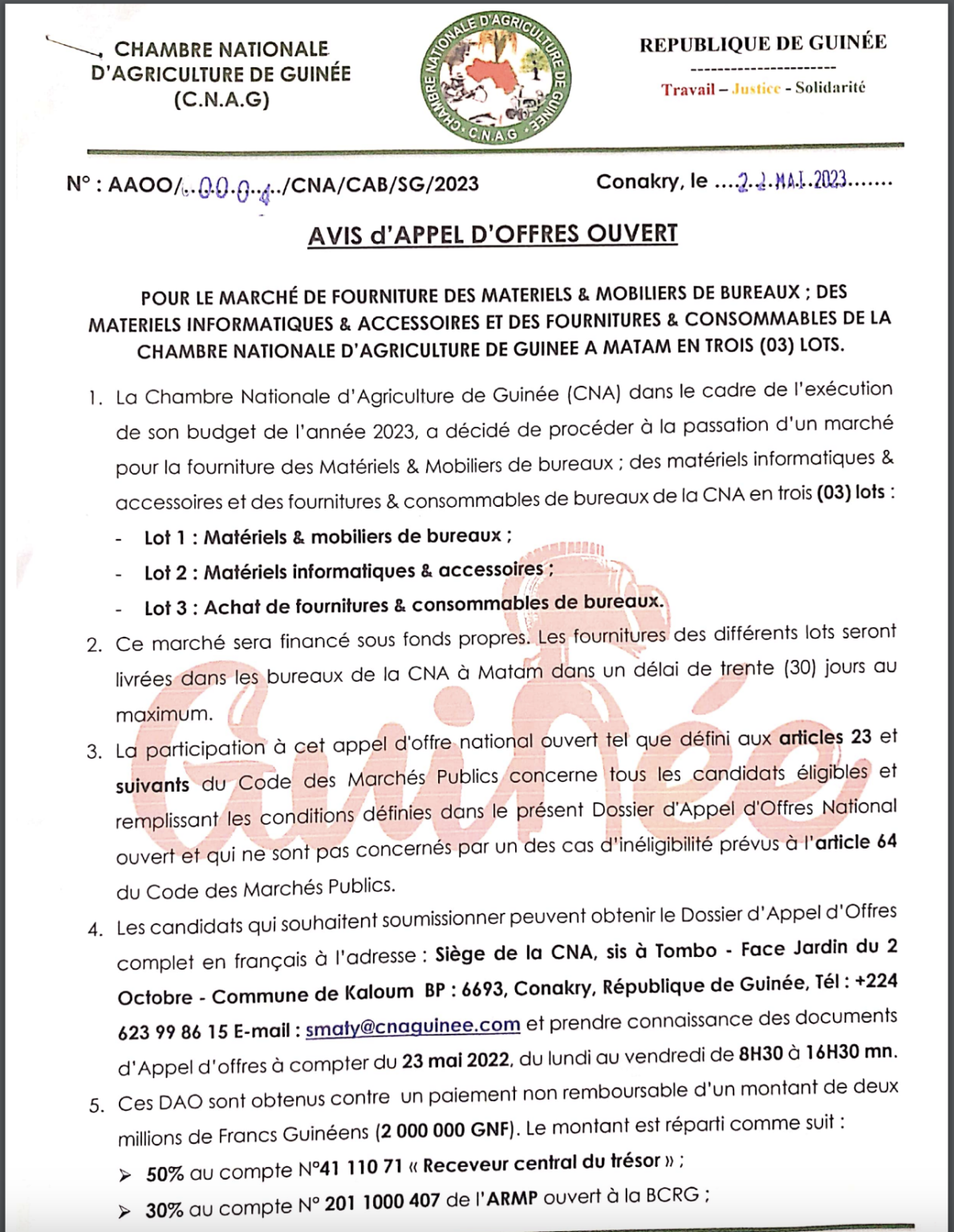 Chambre Nationale d’Agriculture de Guinée : Avis d’appel d’offres ouvert pour la fourniture des matériels et mobiliers de bureaux