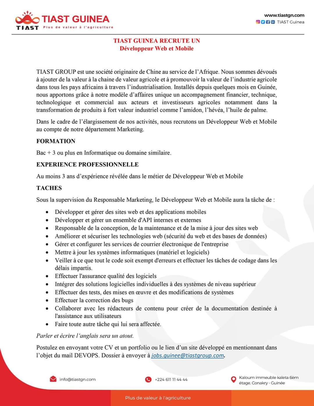 Postulez en envoyant votre CV et un portfolio à l’adresse : jobs.guinee@tiastgroup.com en mentionnant l’intitulé du poste dans l’objet du mail.