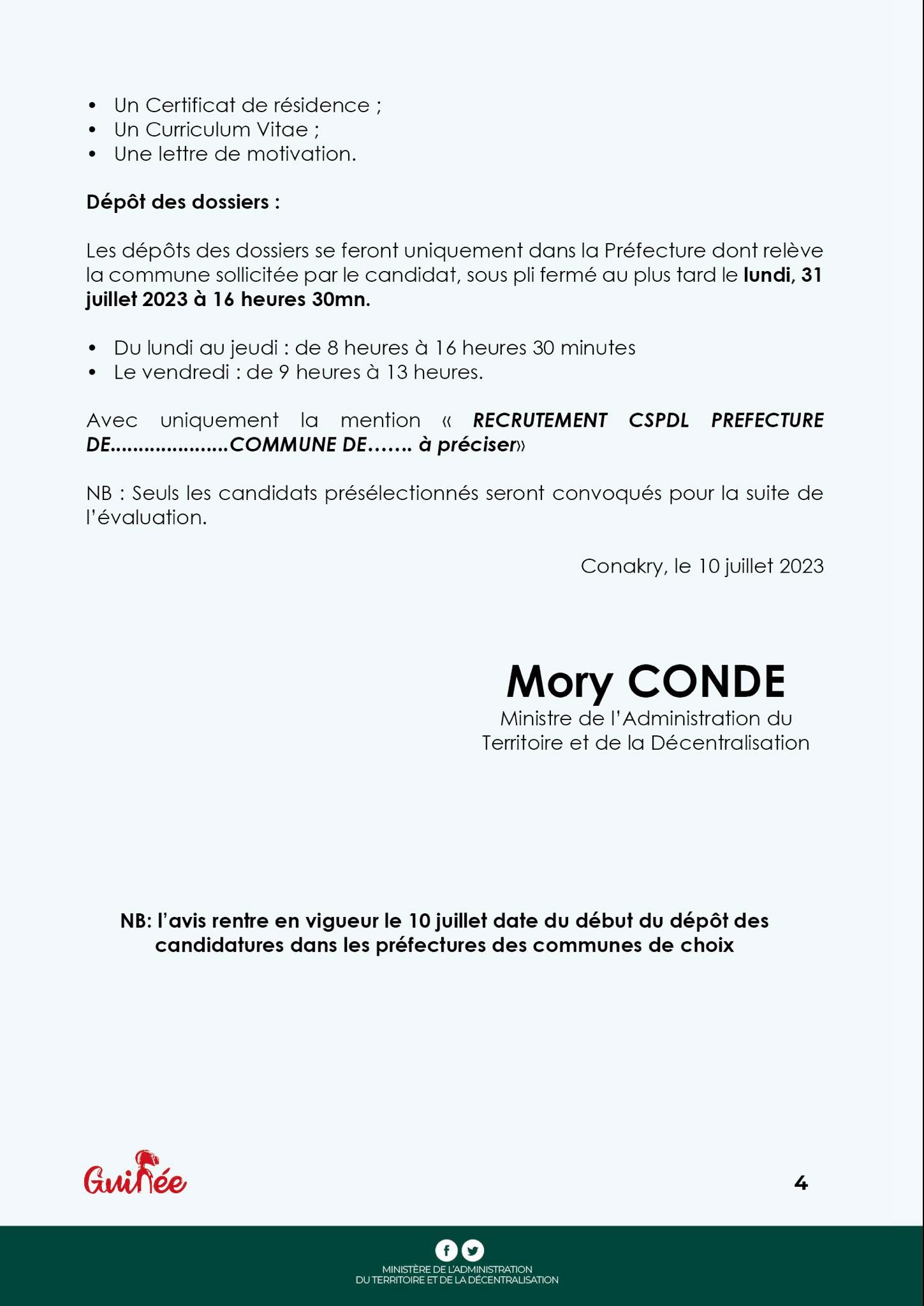 Appel à candidature : recrutement de 362 fonctionnaires des collectivités locales en République de Guinée Offres d'emploi By alphaleserum@gmail.com Last updated Juil 7, 2023 Share Le Ministère de l’Administration du Territoire et la Décentralisation de la République de Guinée recrute : Share
