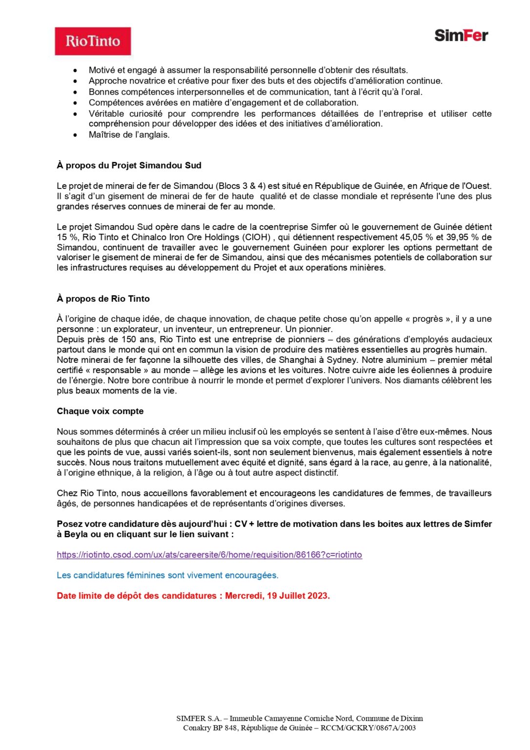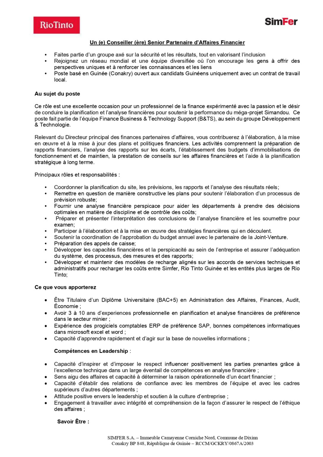Offre d’emploi : Rio Tinto recrute un (e) Conseiller (ère) Senior Partenaire d’Affaires Financier Offres d'emploi By alphaleserum@gmail.com Last updated Juil 6, 2023 Share Share