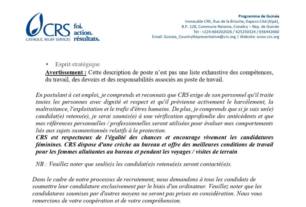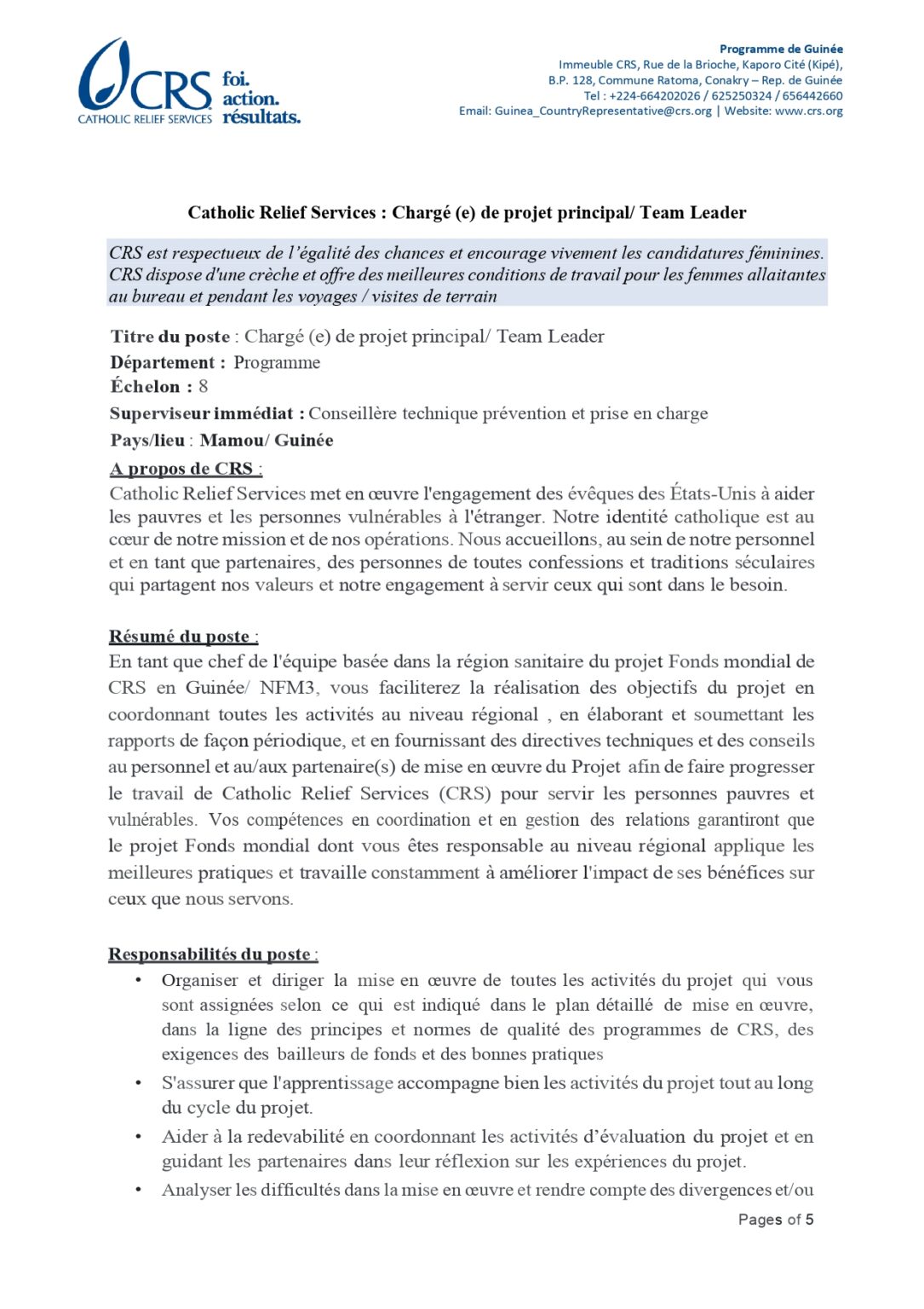 Offre d’emploi : CRS recherche un.e Chargé(e) de projet principal / Team Leader Offres d'emploi By alphaleserum@gmail.com Last updated Juil 10, 2023 Share La date limite de soumission est le 21 juillet 2023, les candidats intéressés peuvent postuler via le lien suivant : https://launchpadrecruitsapp.com/apply/d5d168cc277a3d3b316893a5 catholic relief servicecrs recruteemploi de crs Share