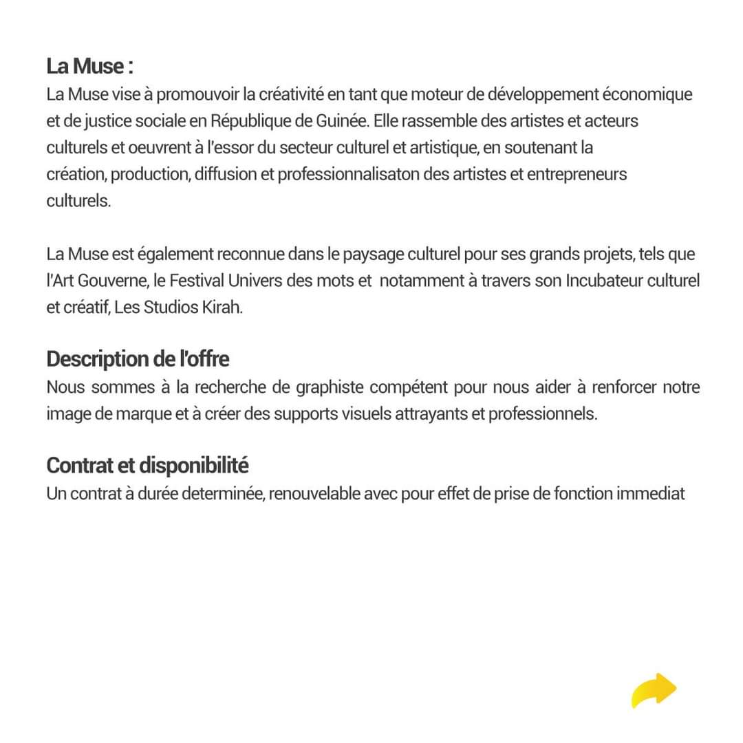 La Muse, un opérateur culturel engagé dans le développement économique et social en Guinée, recherche activement un(e) graphiste talentueux(se) pour renforcer son équipe.