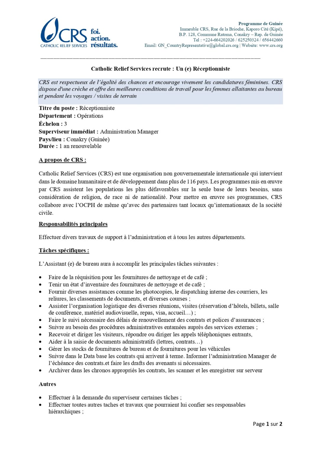 Offre d’emploi : CRS recherche un(e) Réceptionniste