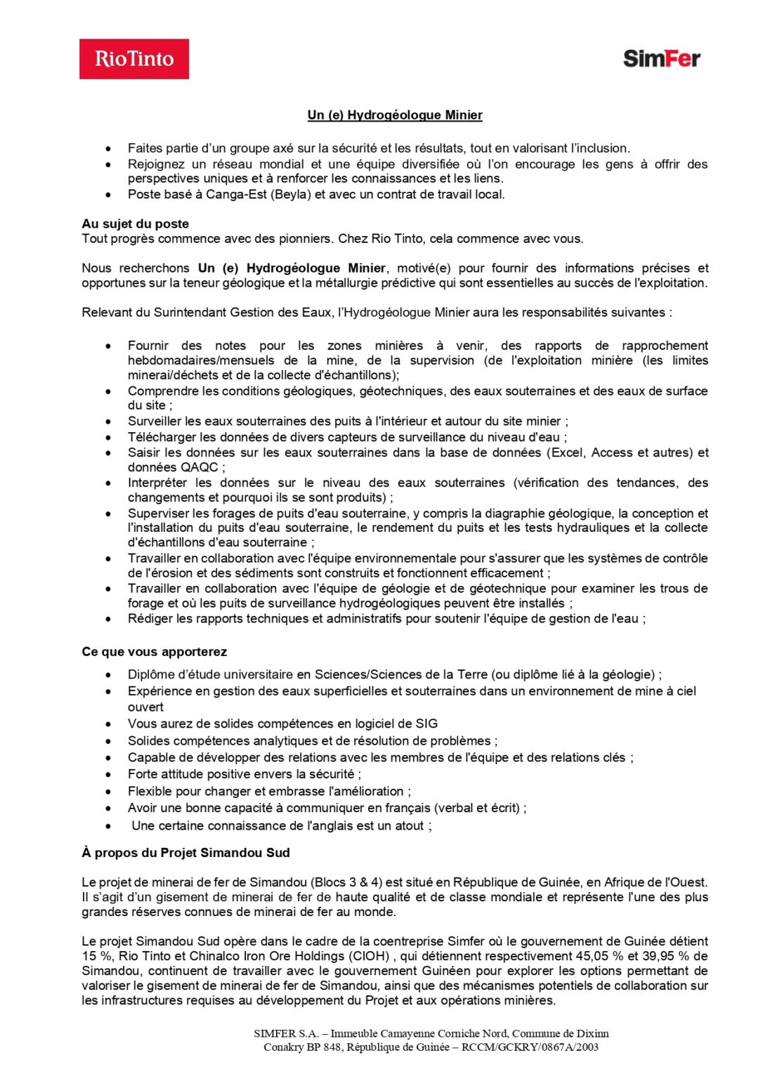 Posez votre candidature dès aujourd’hui : CV + lettre de motivation dans les boites aux lettres de Simfer à Beyla ou en cliquant sur le lien ci-dessous :