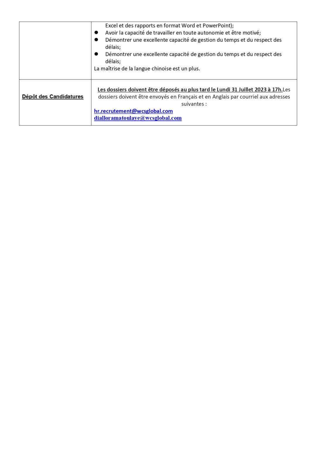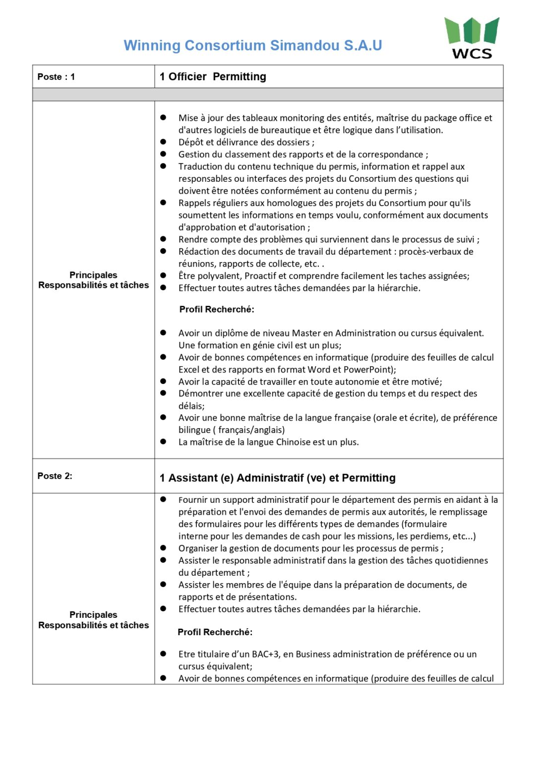 Offre d’emploi : Winning Consortium Simandou recrute un Officier Permitting et un.e Assistant.e Administratif(ve) Permitting Offres d'emploi By alphaleserum@gmail.com Last updated Juil 15, 2023 Share Share