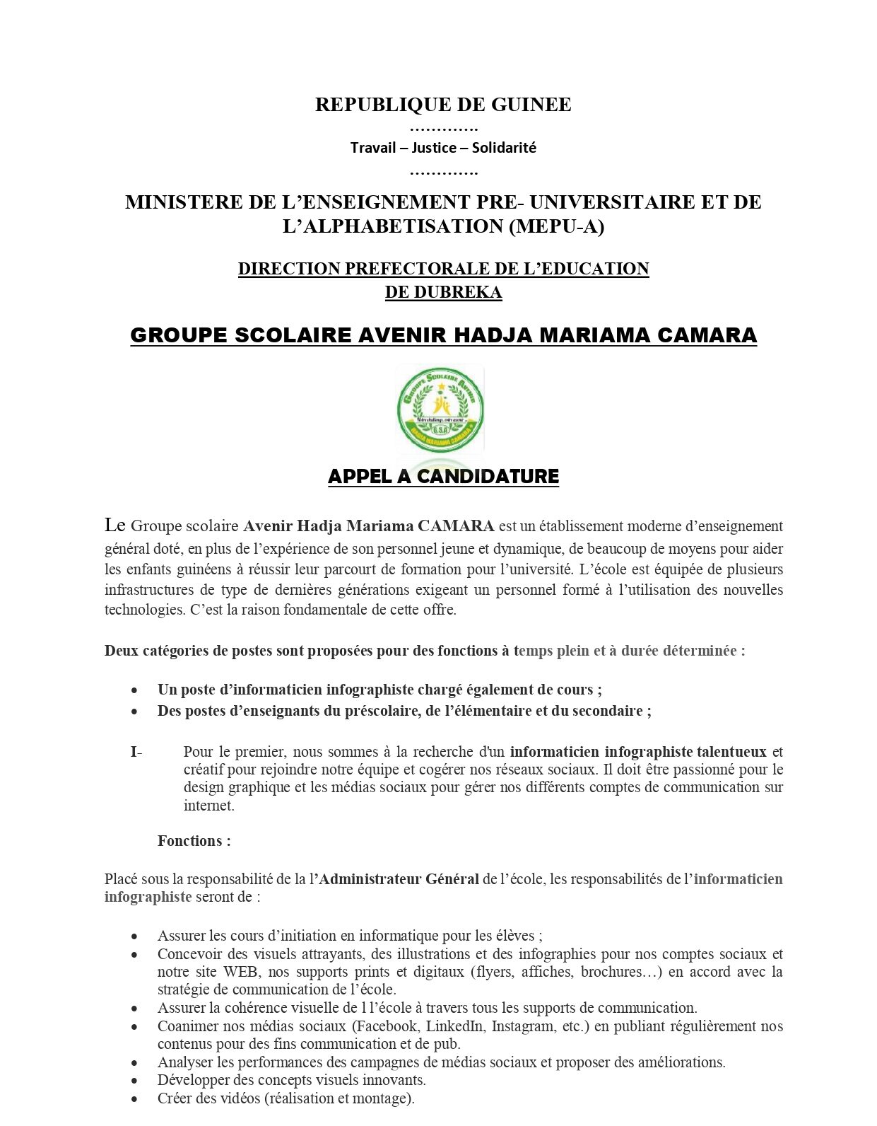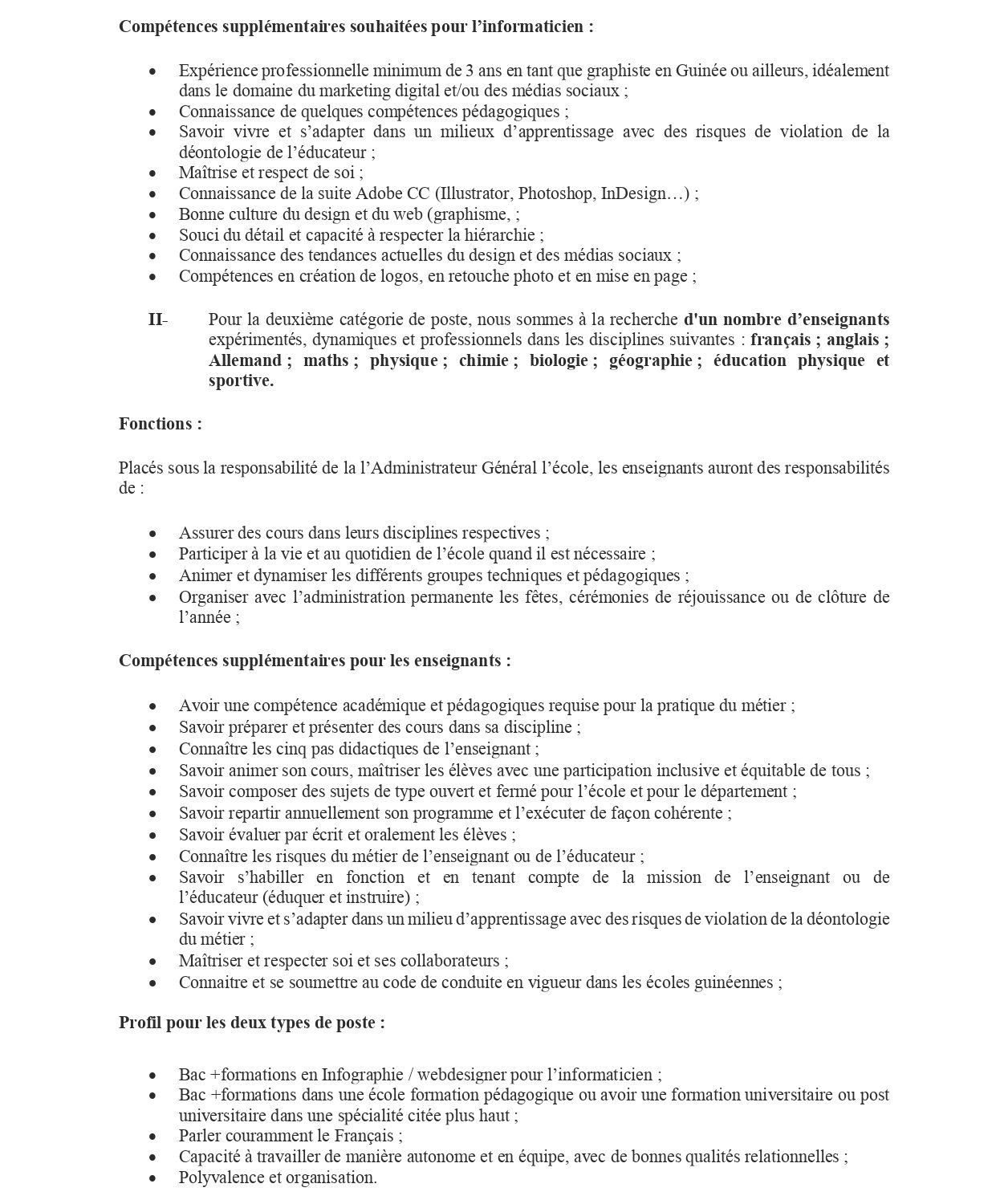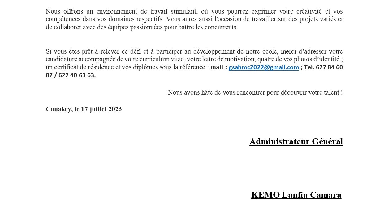 Offre d’emploi : le Groupe Scolaire Avenir HMC recrute un Infographe et des Enseignants Offres d'emploi By alphaleserum@gmail.com Last updated Juil 19, 2023 Share Share