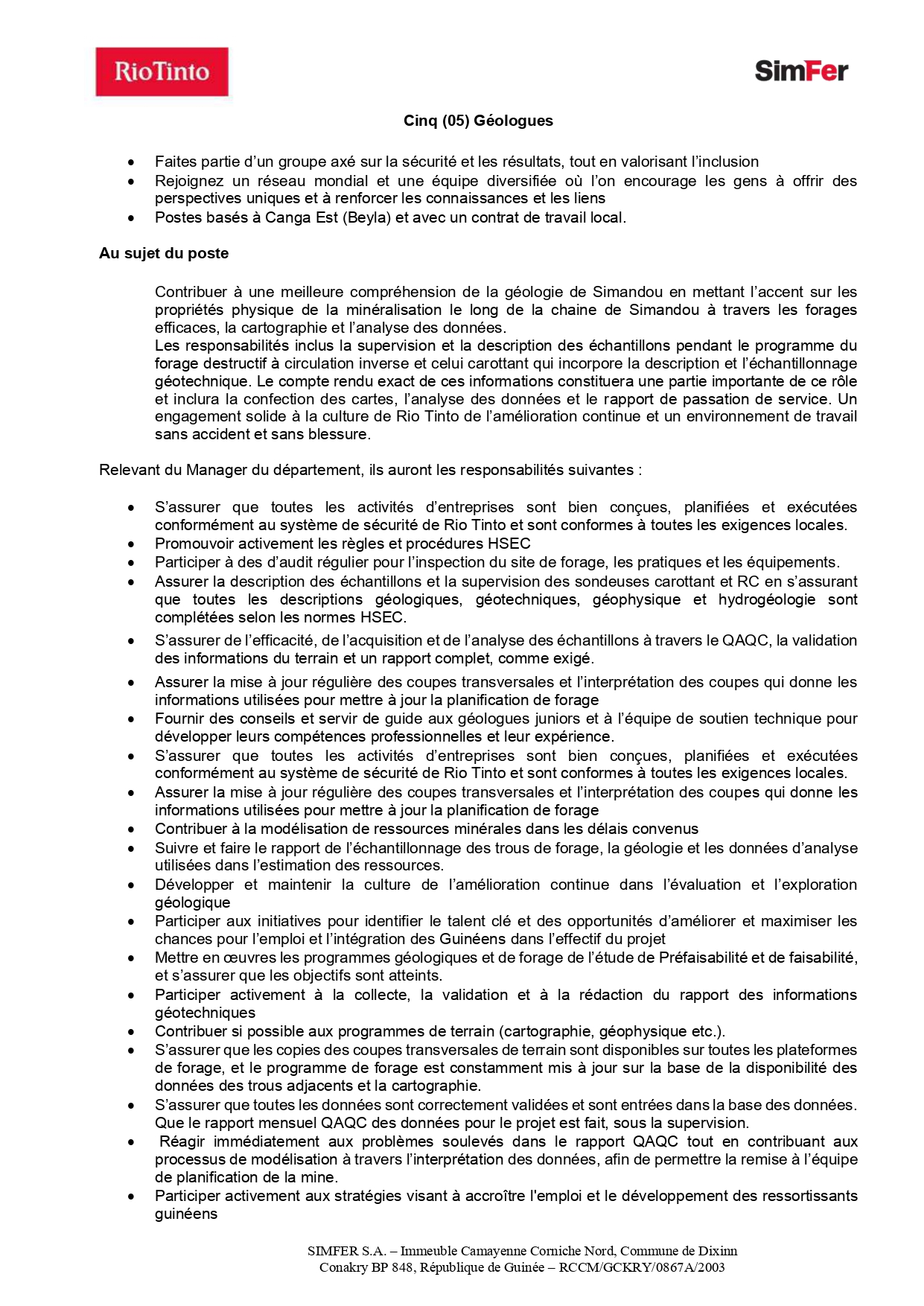 Posez votre candidature dès aujourd’hui : CV + lettre de motivation dans les boites aux lettres de Simfer à Beyla ou en suivant le lien ci dessous