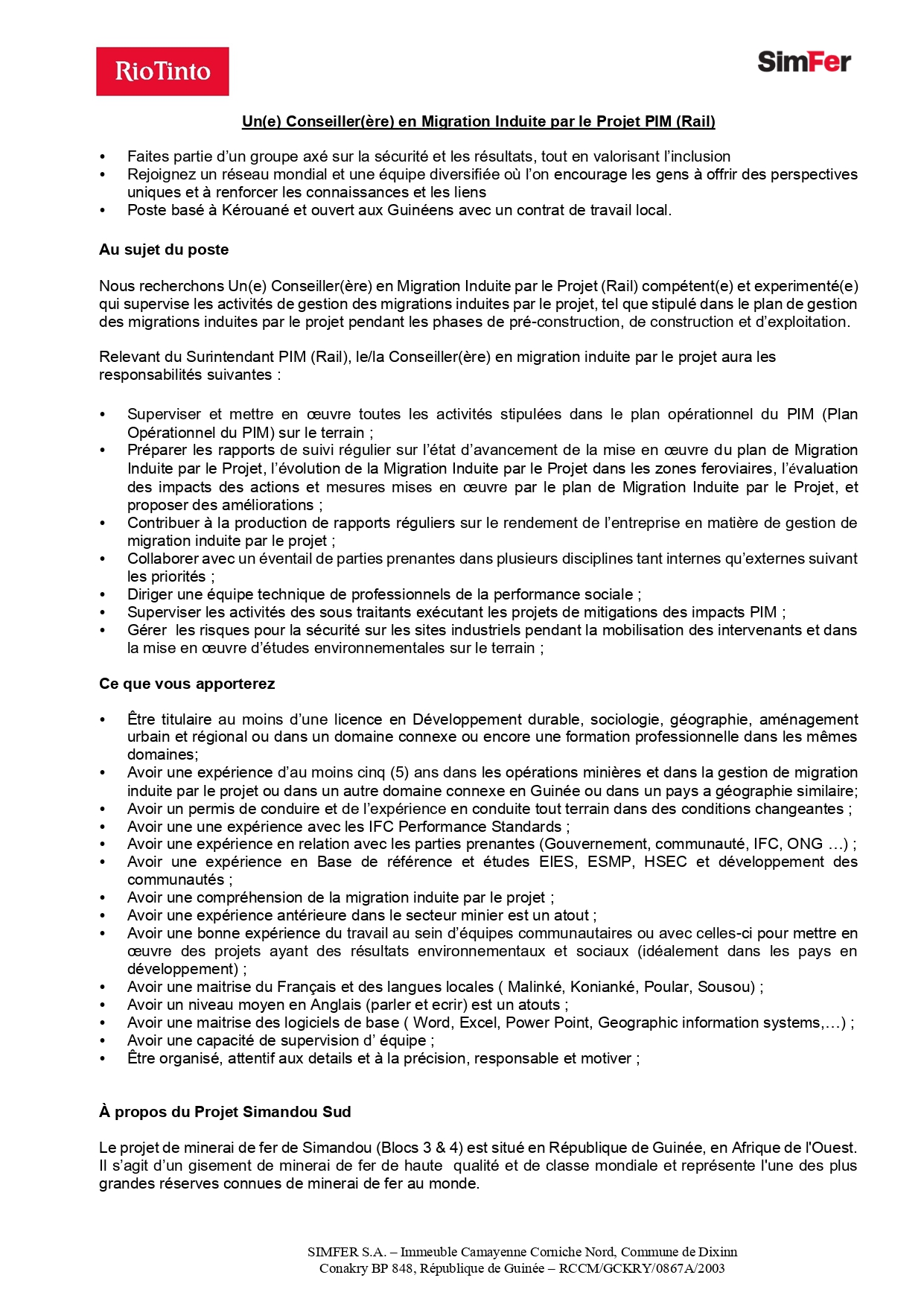 Offre d’emploi : RioTinto recrute un(e) Conseiller(ère) en Migration Induite par le Projet PIM (Rail)