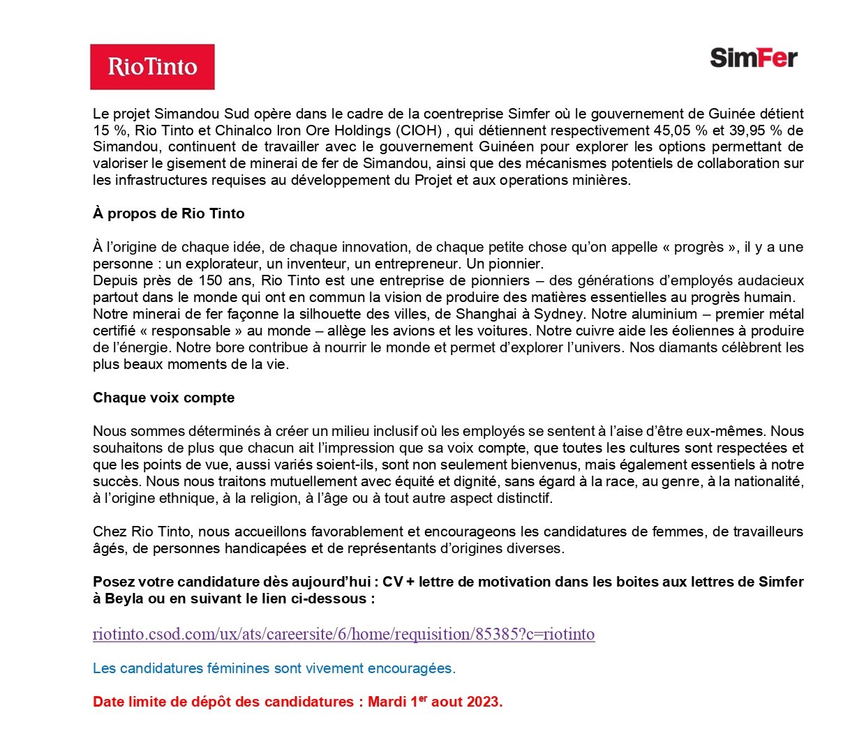 Posez votre candidature dès aujourd’hui : CV + lettre de motivation dans les boites aux lettres de Simfer à Beyla ou en suivant le lien ci-dessous : riotinto.csod.com/ux/ats/careersite/6/home/requisition/85385?c=riotinto