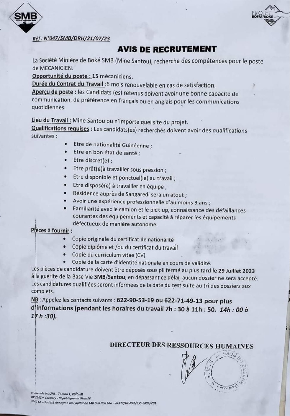 Offre d’emploi : la SMB recrute 15 Mécaniciens Offres d'emploi By alphaleserum@gmail.com On Juil 23, 2023 Share Share