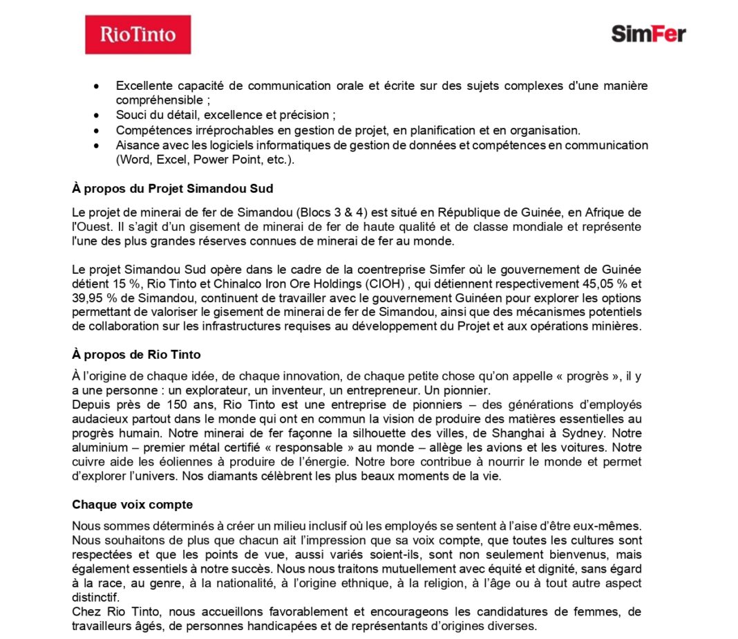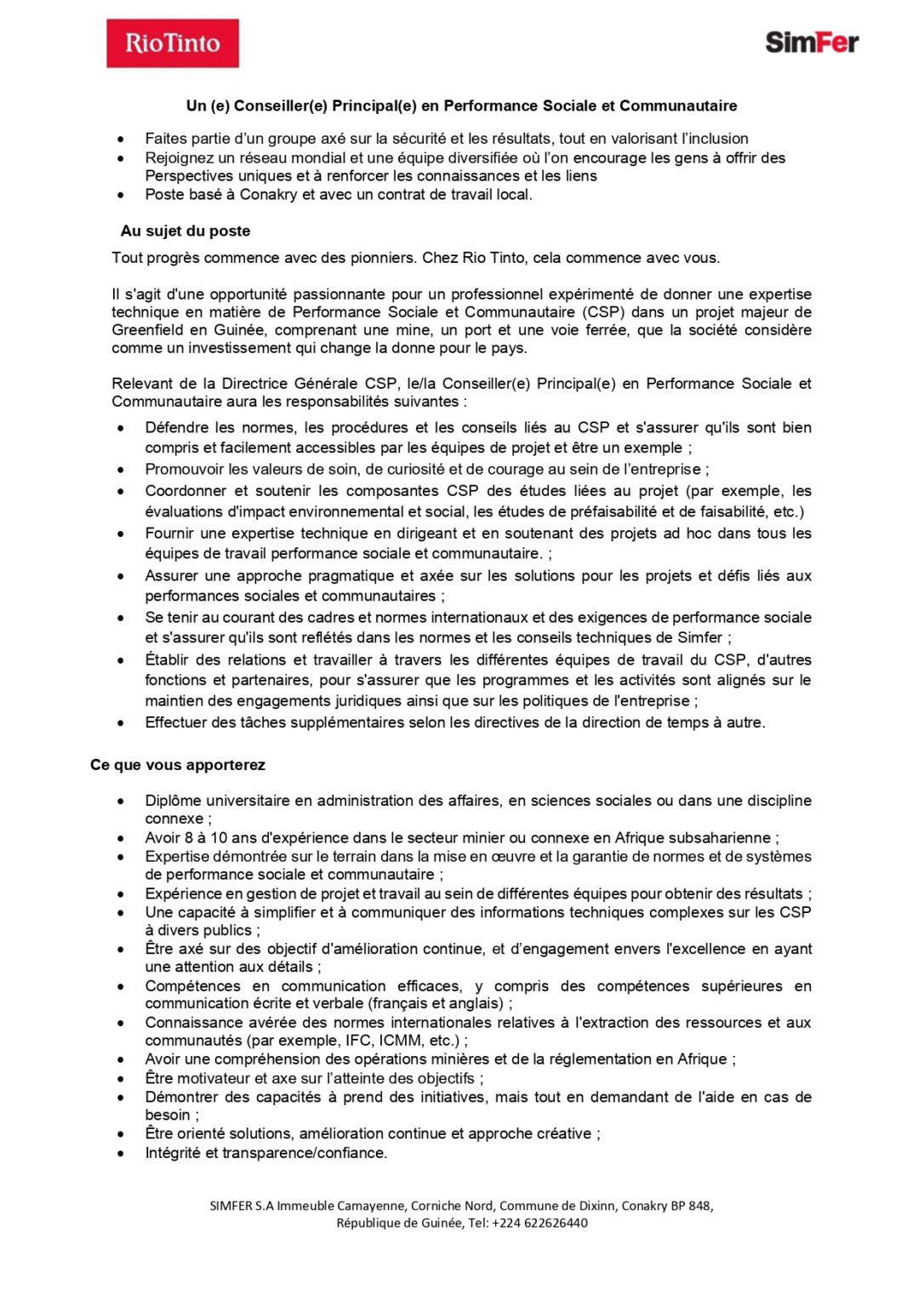 Offre d’emploi : RioTinto recrute Un(e) Conseiller(e) Principal(e) en Performance Sociale et Communautaire