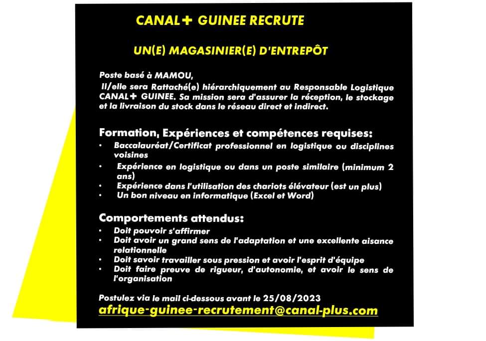 Offre d’emploi : CANAL+GUINEE recrute un(e) Magasinier(ère) d’entrepôts Offres d'emploi By alphaleserum@gmail.com Last updated Août 17, 2023 Share Vous avez le profil et répondez à tous les critères? Postulez via cette adresse : afrique_guinee_recrutement@canal-plus.com avant le 25 août 2023 Share
