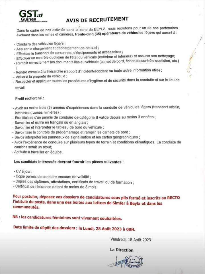 Offre d’emploi : GST Guinea recrute 35 Opérateurs de véhicules légers Offres d'emploi By alphaleserum@gmail.com Last updated Août 19, 2023 Share Dans le cadre nos activités dans la zone de Bayla, GST Guinea recrute pour un de ses partenaires évoluant dans les mines et carrière, TRENTE CINQ (35) OPÉRATEURS DE VÉHICULES LÉGERS . Plus d’informations sur la fiche ci-dessous : Share