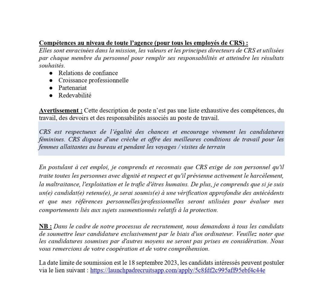 Offre d’emploi : CRS recrute un(e) Finance Officer Offres d'emploi By alphaleserum@gmail.com Last updated Sep 5, 2023 Share La date limite de soumission est le 18 septembre 2023, les candidats intéressés peuvent postuler via le lien suivant : https://launchpadrecruitsapp.com/apply/5c8fdf2c995aff95ebf4c44e Share