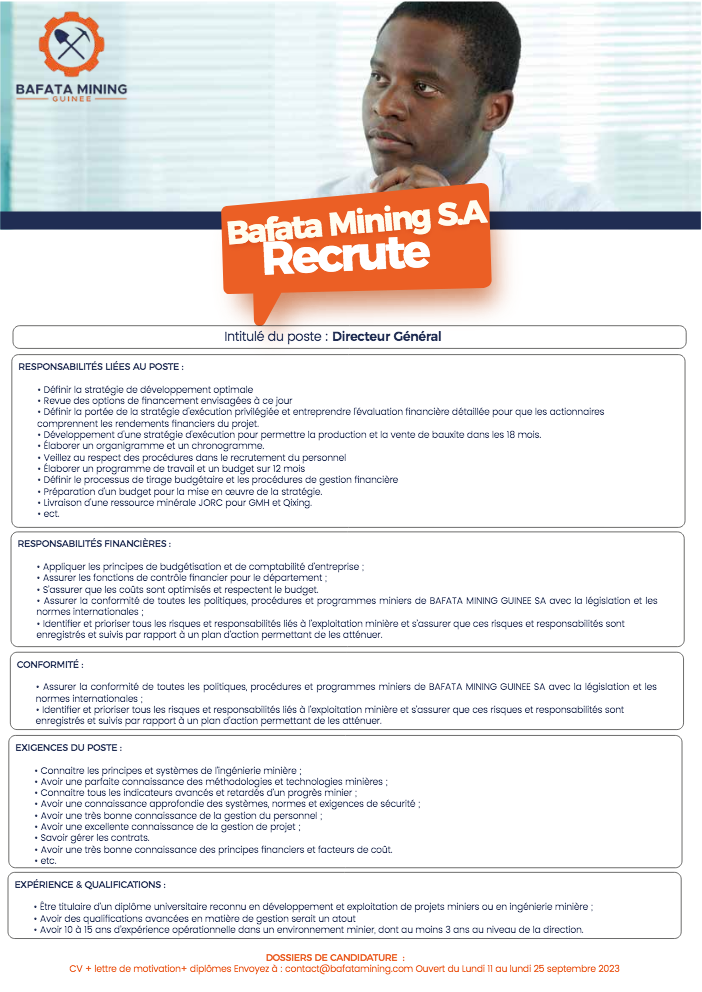 Offre d’emploi : BAFATA Mining recherche un Directeur Général