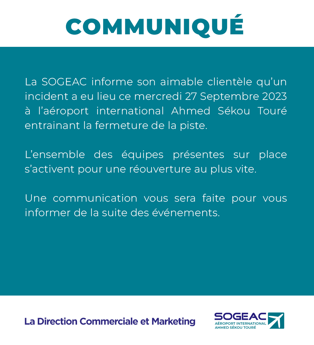 Aéroport de Conakry : la piste est fermée après un incident (SOGEAC) Communiqué By alphaleserum@gmail.com Last updated Sep 27, 2023 Share Share