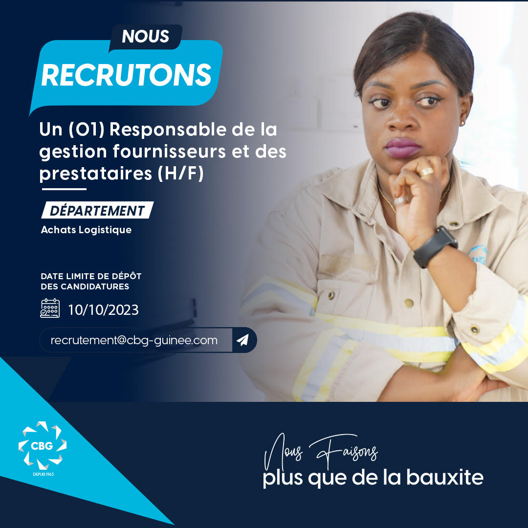 Offre d’emploi : la CBG recrute un responsable de la gestion fournisseurs et des prestataires (H/F) Offres d'emploi By alphaleserum@gmail.com Last updated Oct 1, 2023 Share Télécharger l’offre complète en cliquant sur le lien suivant : 👇 👇👇 Annonce-RGFP Share