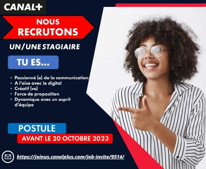 Appel à candidatures : CANAL+ recherche un(e) Stagiaire en Communication Appel à candidaturesOpportunités By alphaleserum@gmail.com Last updated Oct 6, 2023 Share APPEL A CANDIDATURES CANAL+ GUINEE recherche un/une stagiaire en COMMUNICATION Vous êtes passionné (e) de la communication et avez une bonne connaissance du digital. Vous souhaitez rejoindre une équipe dynamique? Postulez via le lien ci-dessous : https://joinus.canalplus.com/job-invite/9514 Share