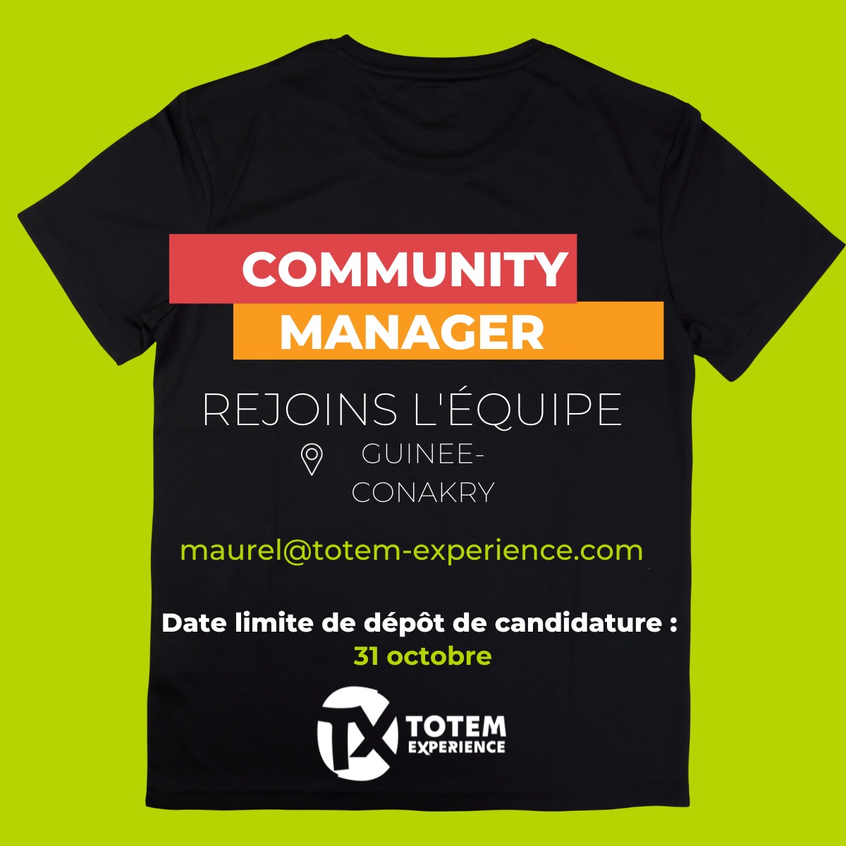 Offre d’emploi : Totem Expérience recrute 1 Community Manager Offres d'emploi By alphaleserum@gmail.com Last updated Oct 17, 2023 Share Dossier à fournir : un CV et une lettre de motivation Plus d’informations sur le site suivant : http://totem-experience.com/ Share