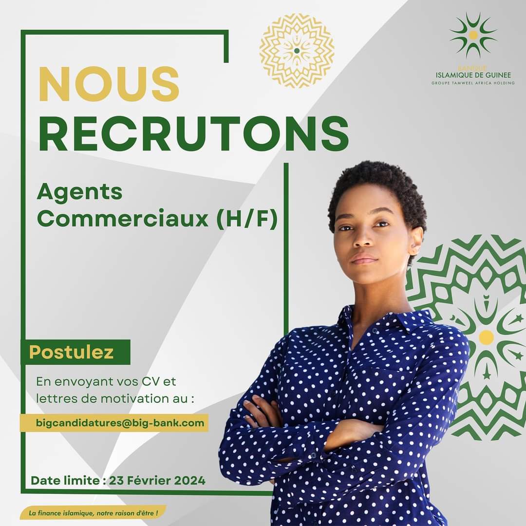 Offre d’emploi : la Banque Islamique de Guinée recrute des Agents Commerciaux (H/F) Offres d'emploi By alphaleserum@gmail.com On Fév 15, 2024 Share Nous recrutons pour les postes de : Agents commerciaux (H/F). Postulez en envoyant vos CV et Lettres de motivation au : bigcandidatures@big-bank.com Date limite : le 23 Février 2024. Share