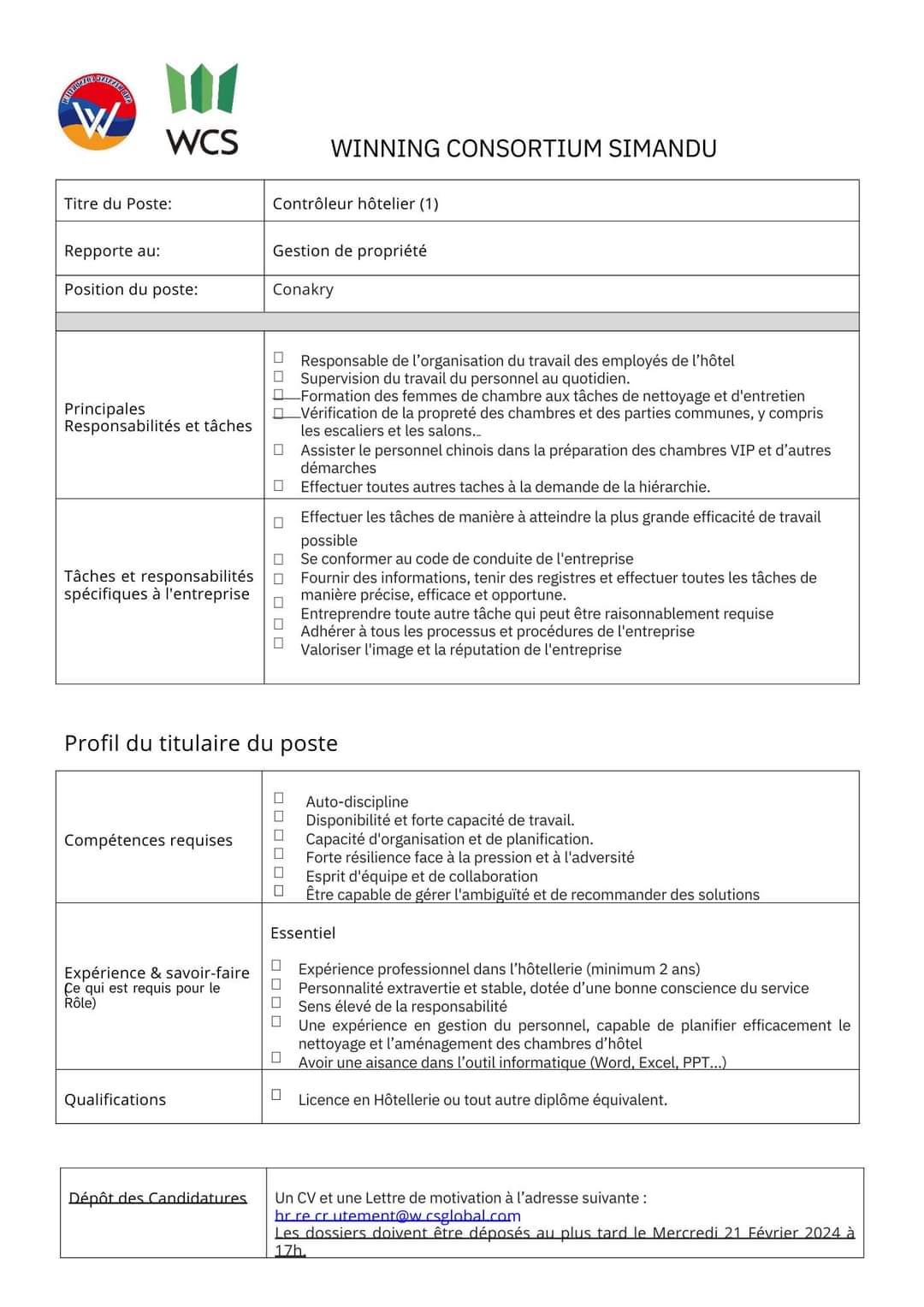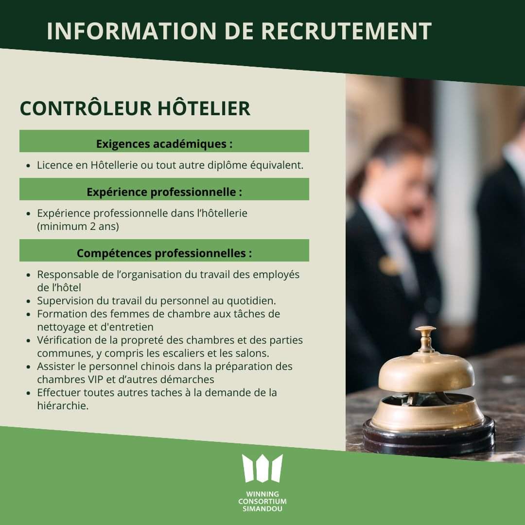 Offre d’emploi : Winning Consortium Simandou recrute un Contrôleur Hôtelier Offres d'emploi By alphaleserum@gmail.com On Fév 20, 2024 Share Share