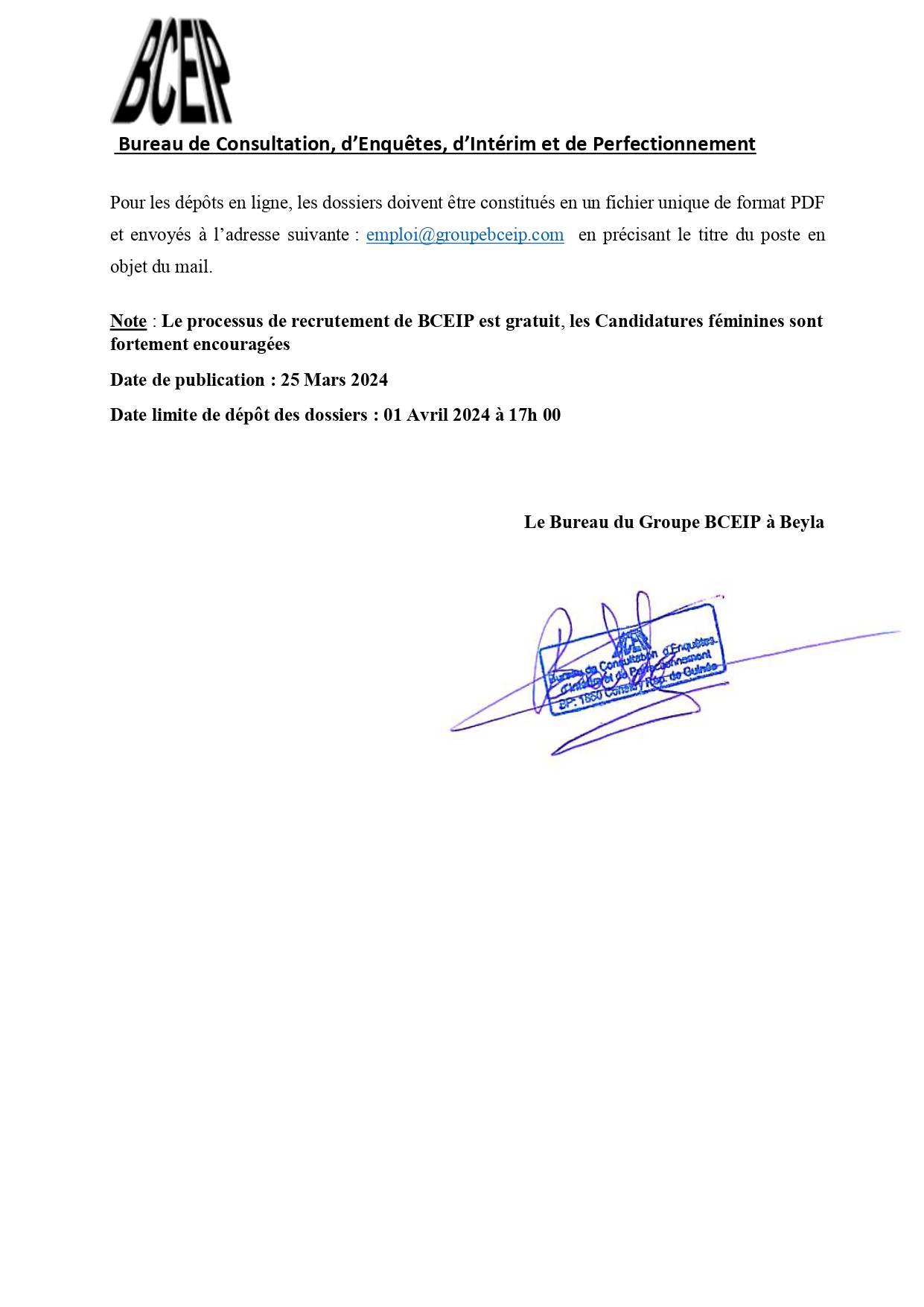 Dans le cadre de l’exécution d’un projet au compte d’une société de la place, le Bureau de Consultation, d’Enquêtes, d’Intérim et de Perfectionnement (BCEIP) offre des opportunités d’emploi aux personnes de nationalité guinéenne pour son bureau à Beyla