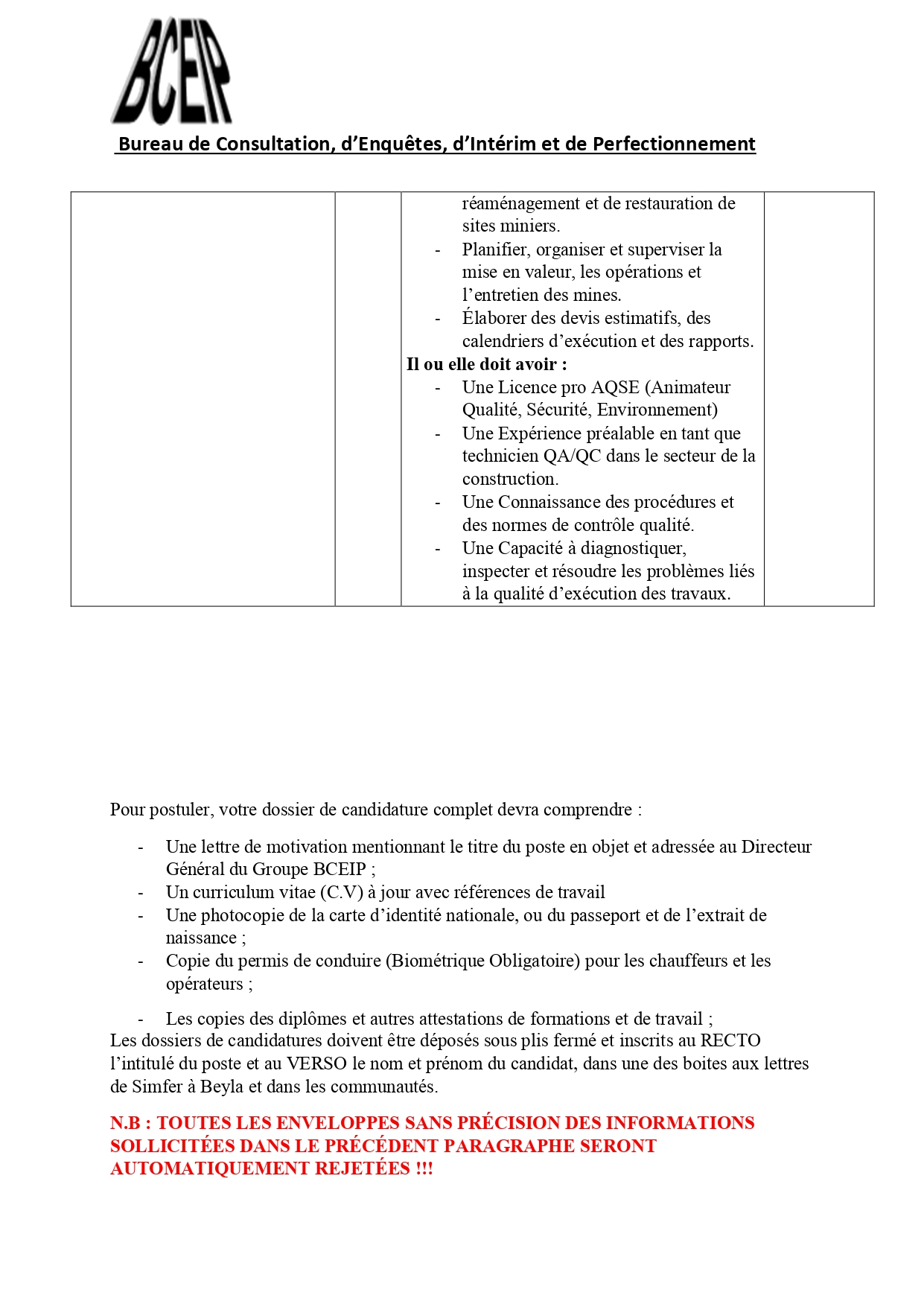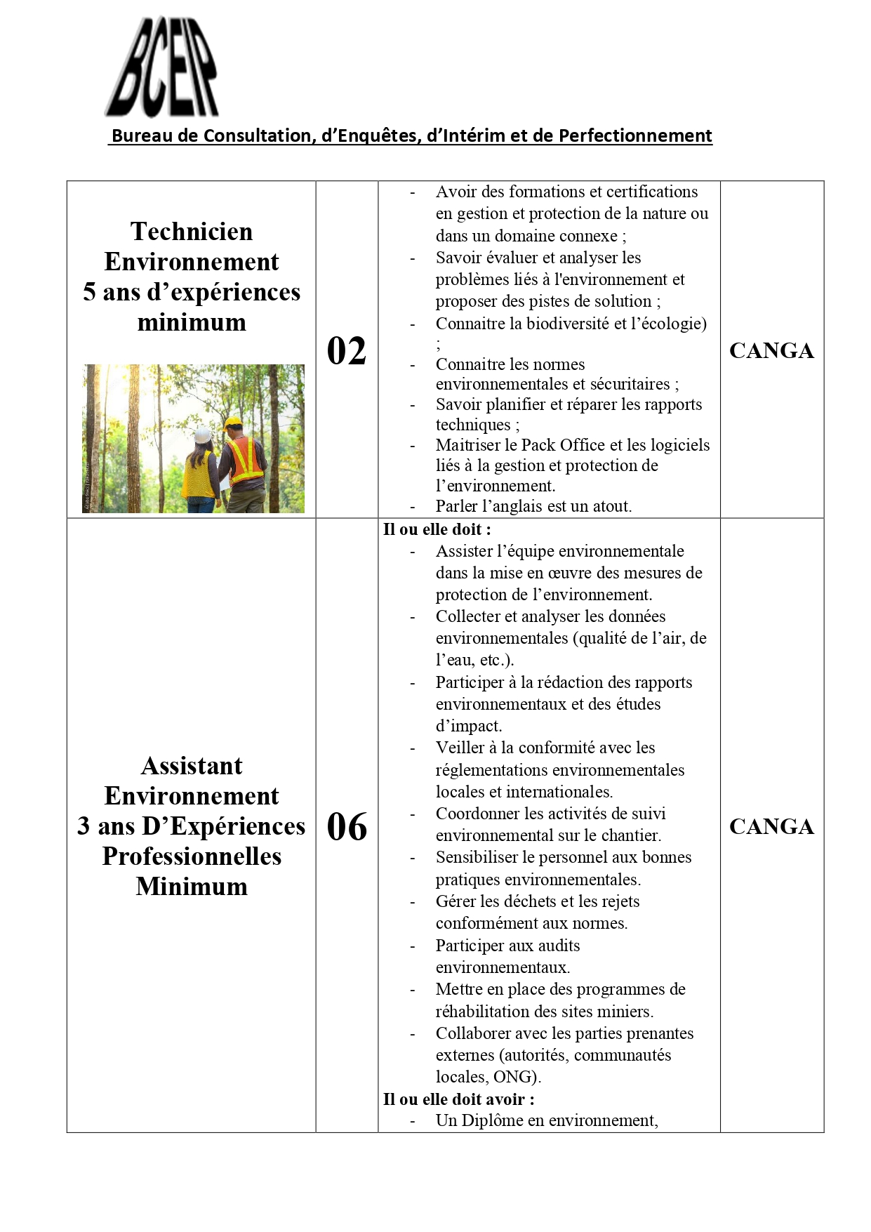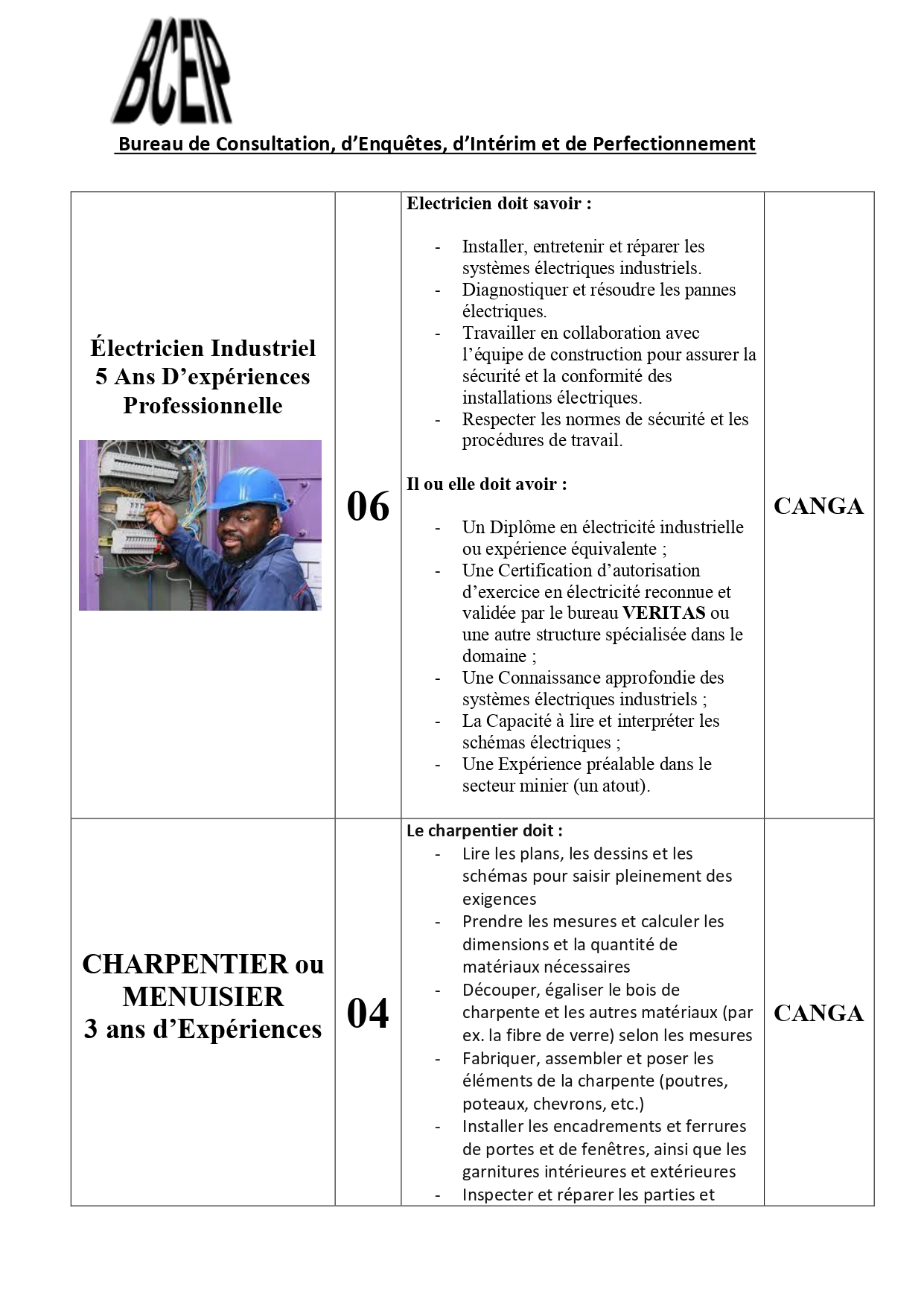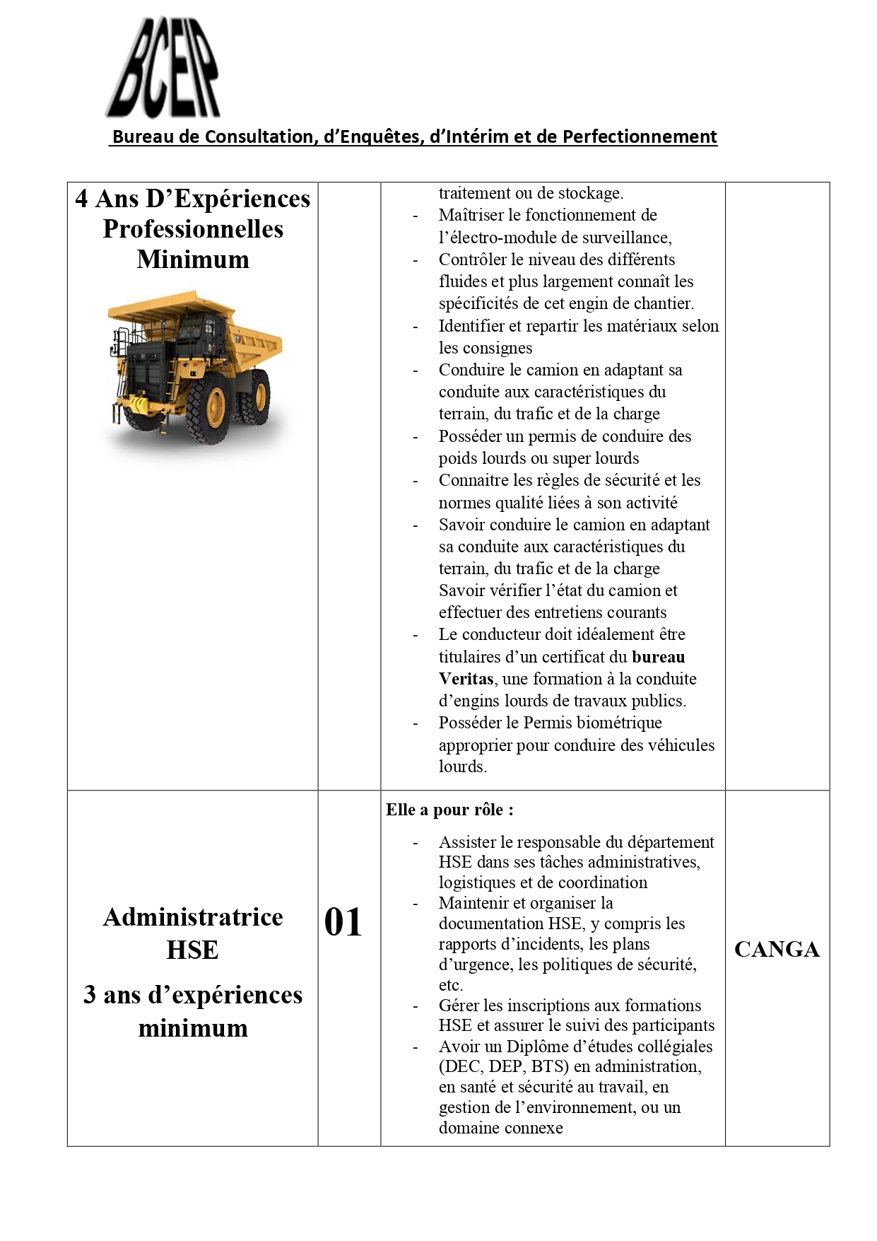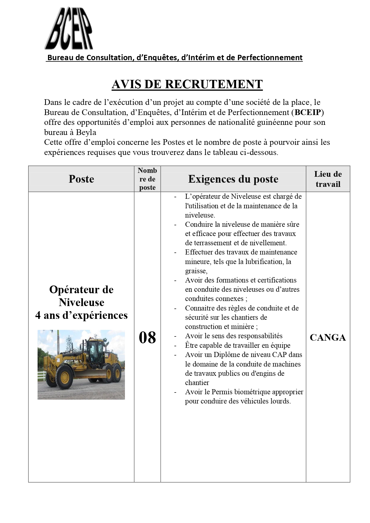 Dans le cadre de l’exécution d’un projet au compte d’une société de la place, le Bureau de Consultation, d’Enquêtes, d’Intérim et de Perfectionnement (BCEIP) offre des opportunités d’emploi aux personnes de nationalité guinéenne pour son bureau à Beyla