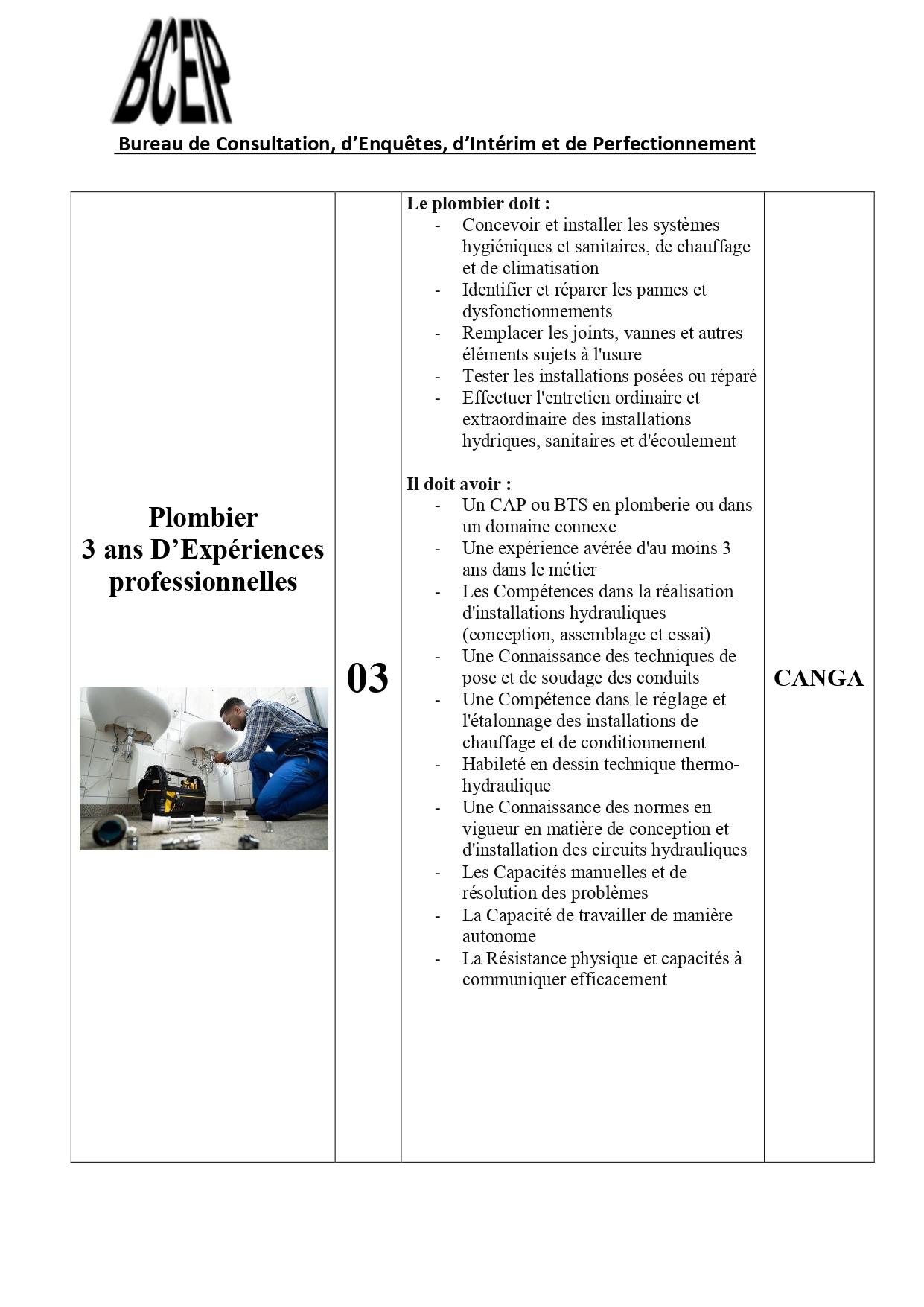 Cette offre d’emploi concerne les Postes et le nombre de poste à pourvoir ainsi les expériences requises que vous trouverez dans le tableau ci-dessous.