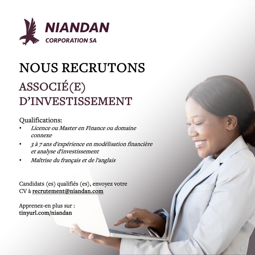 Niandan Corporation SA, une société guinéenne de gestion d’investissements et de conseil, fondée pour accélérer la transformation inclusive en Guinée et en Afrique de l’Ouest, recrute trois professionnels à temps plein pour les postes suivants :