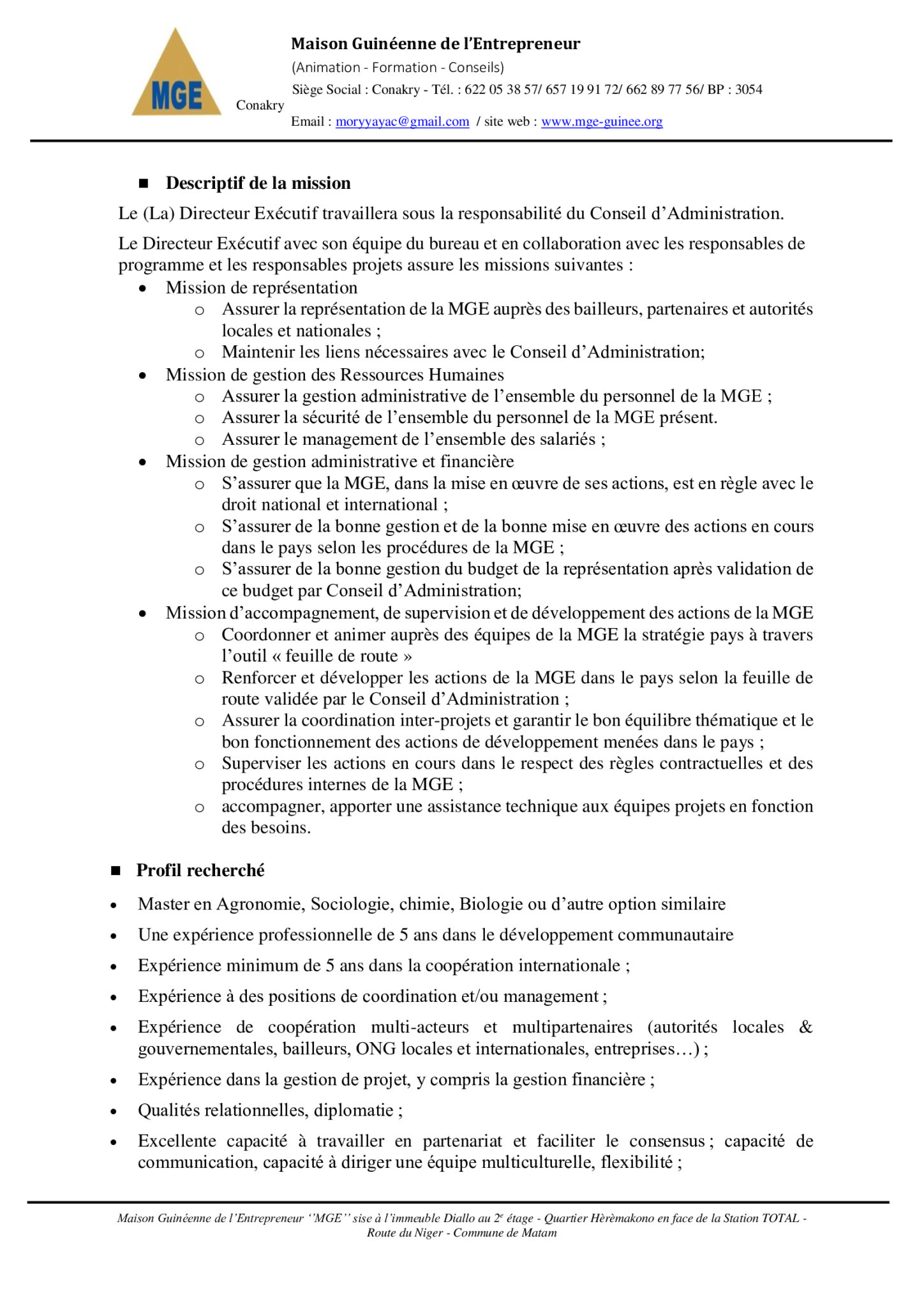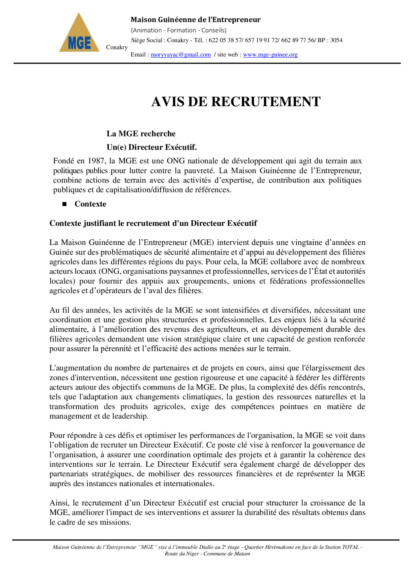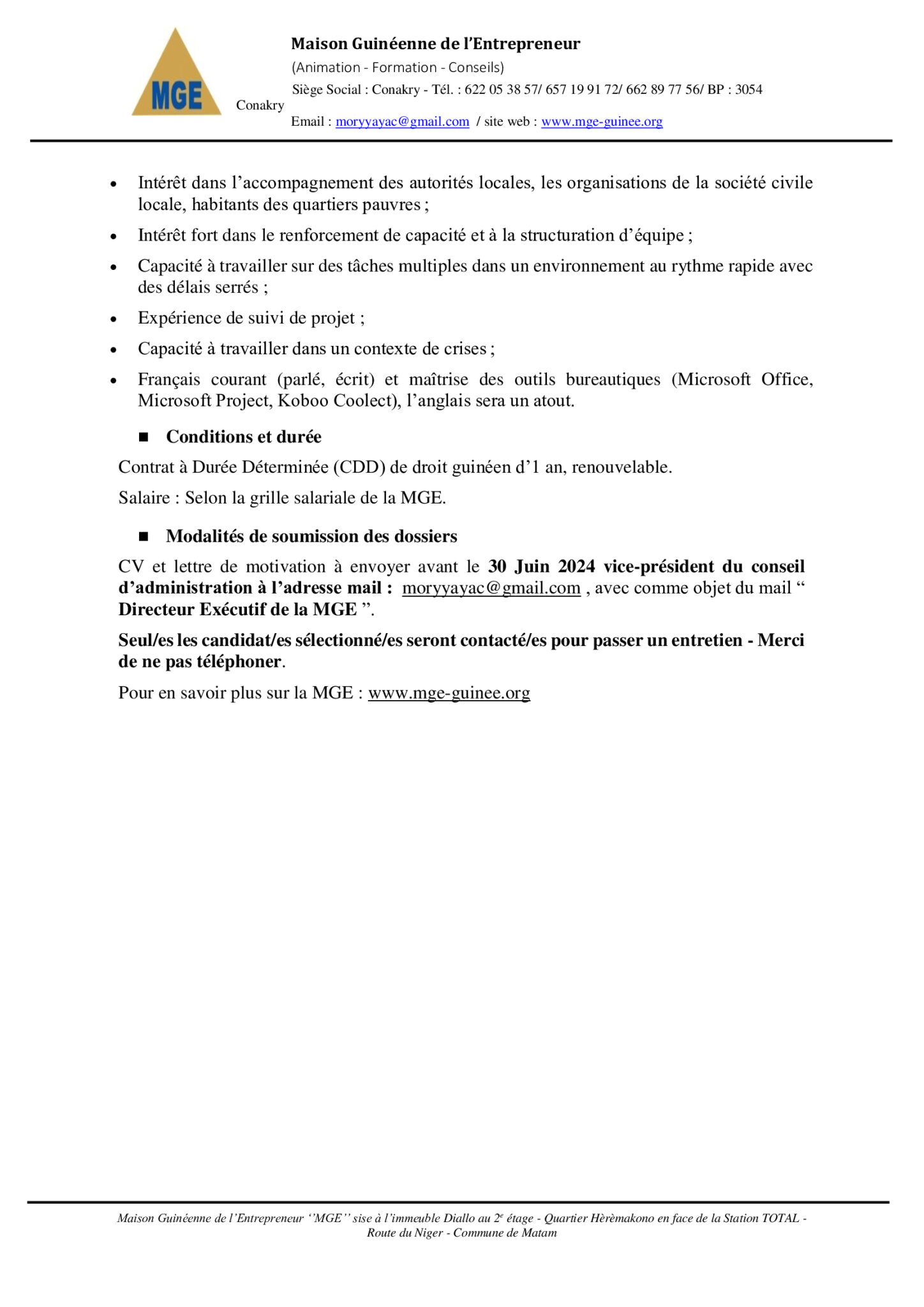 Offre d’emploi : la Maison Guinéenne de l’Entrepreneur recrute un(e) Directeur(trice) Exécutif(tive) Offres d'emploi By alphaleserum@gmail.com Last updated Juin 24, 2024 Share Share