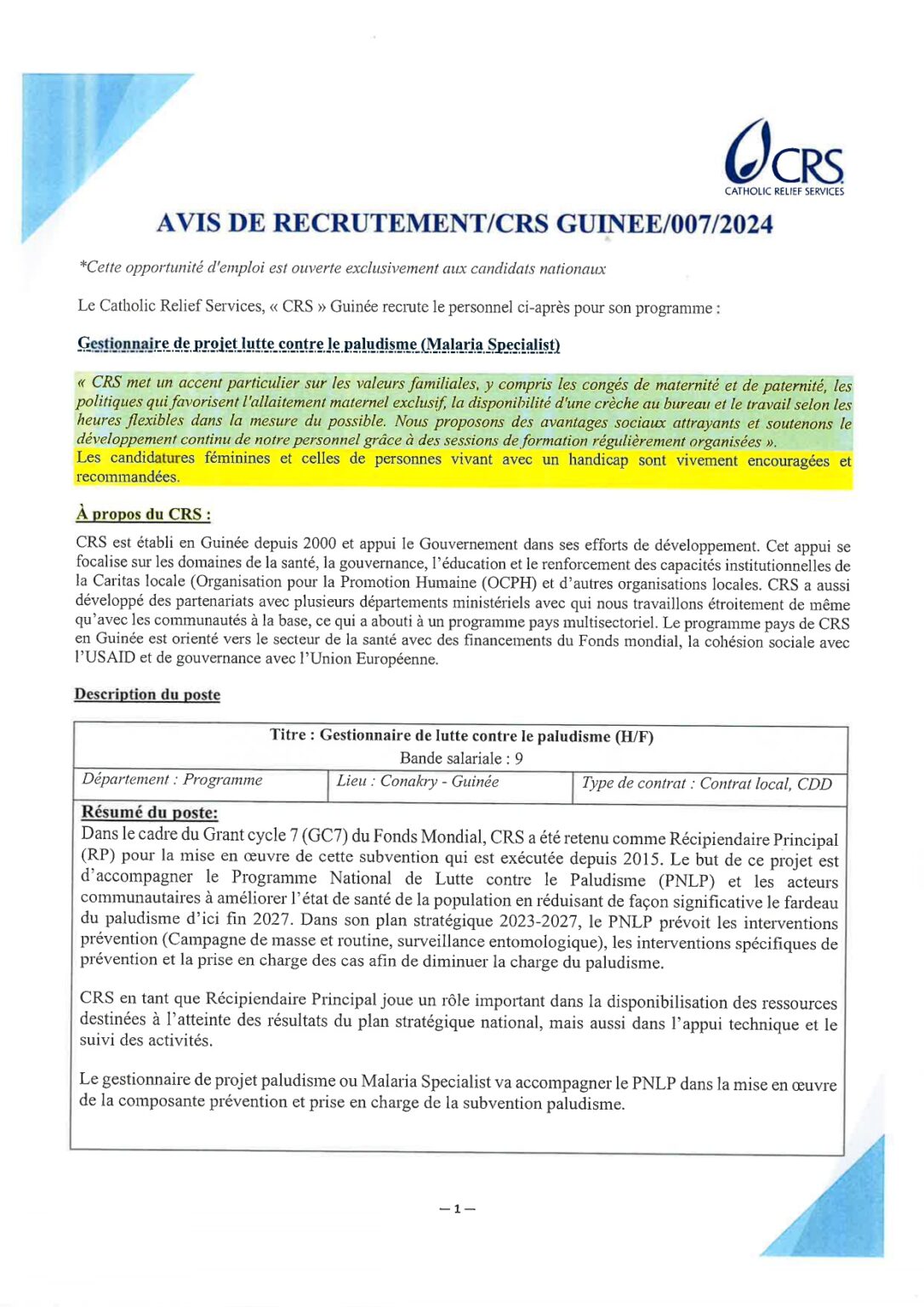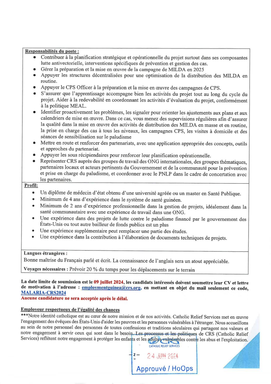 Offre d’emploi : CRS recrute un(e) Gestionnaire de Projet Malaria Offres d'emploi By alphaleserum@gmail.com On Juin 29, 2024 Share Share