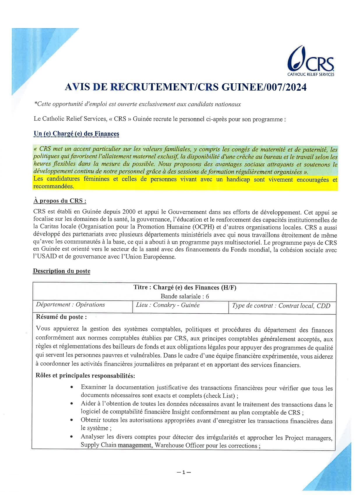 • Offre d’emploi : CRS recrute un(e) Chargé(e) des Finances