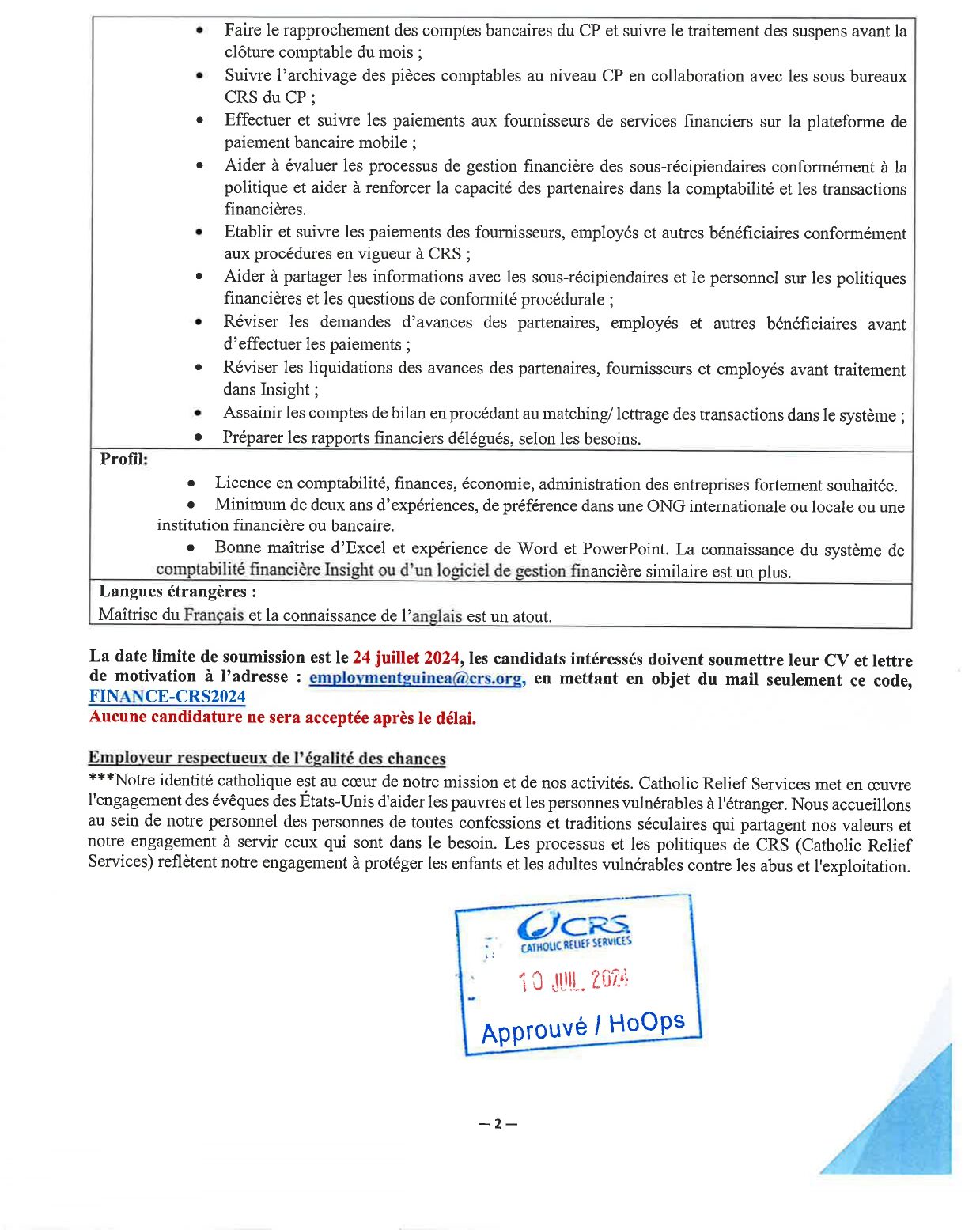 Offre d’emploi : CRS recrute un(e) Chargé(e) des Finances