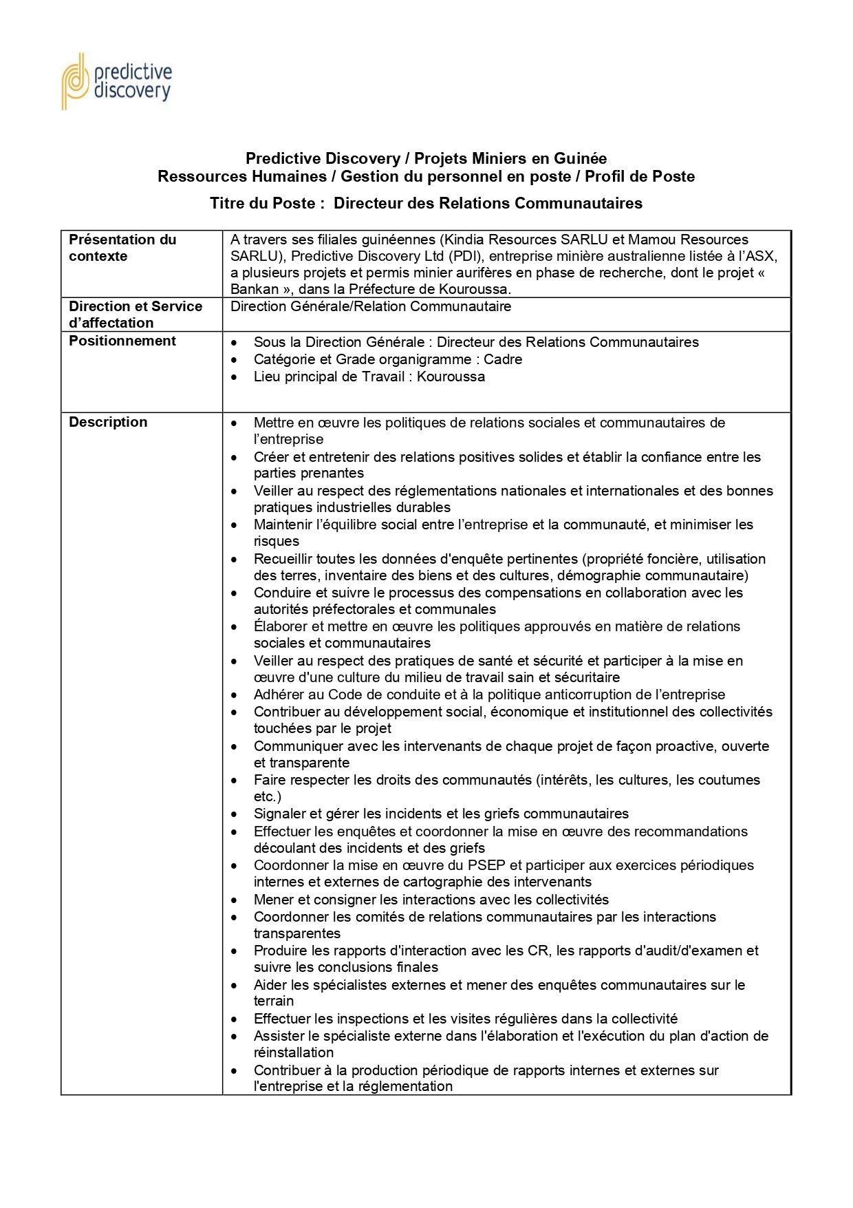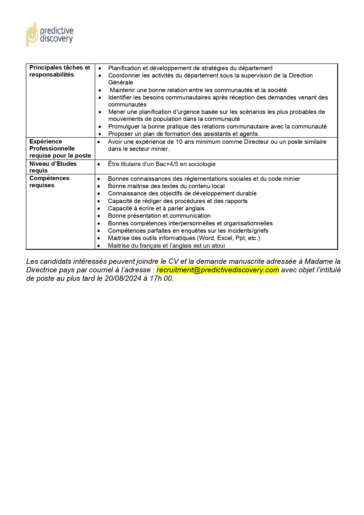 Offre d’emploi : Predictive Discovery recrute un Directeur des Relations Communautaires Offres d'emploi By alphaleserum@gmail.com Last updated Août 15, 2024 Share Share