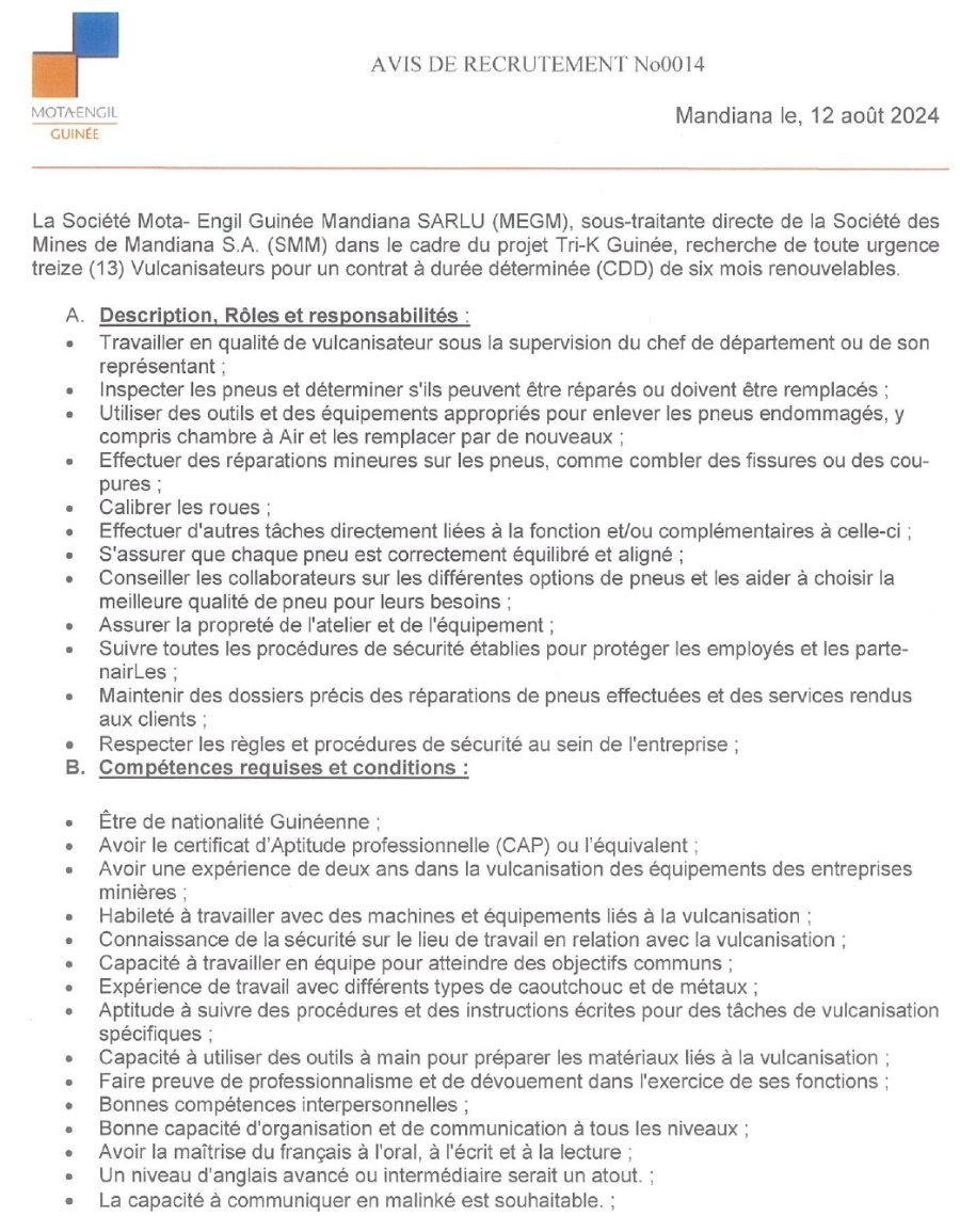 Offre d’emploi : Mota-Engil recrute Guinée recrute treize (13) Vulcanisateurs Offres d'emploi By alphaleserum@gmail.com On Août 20, 2024 Share Share