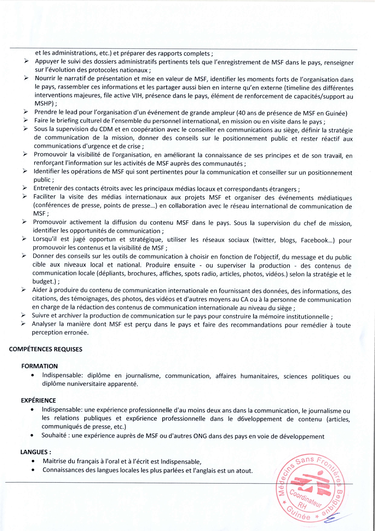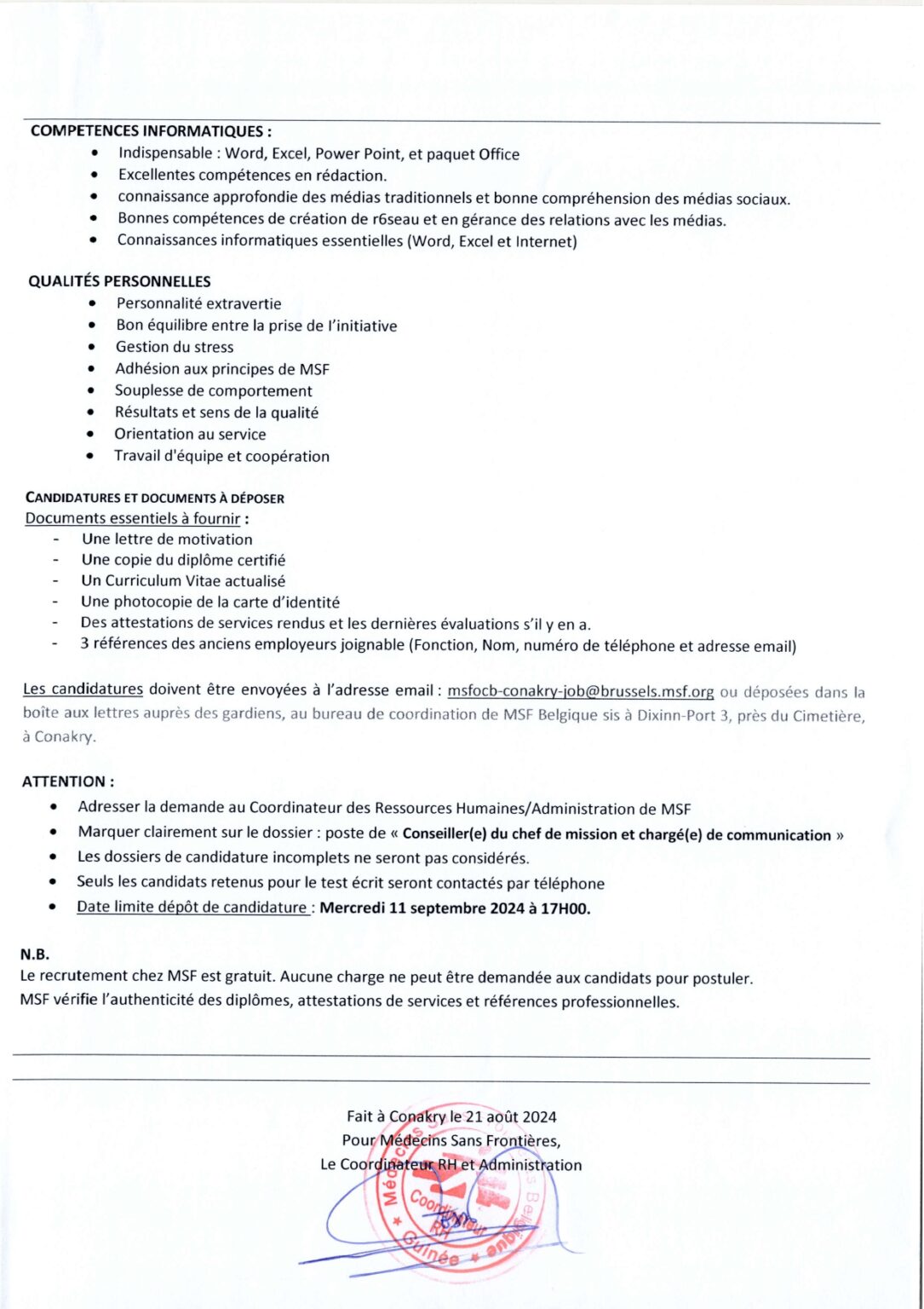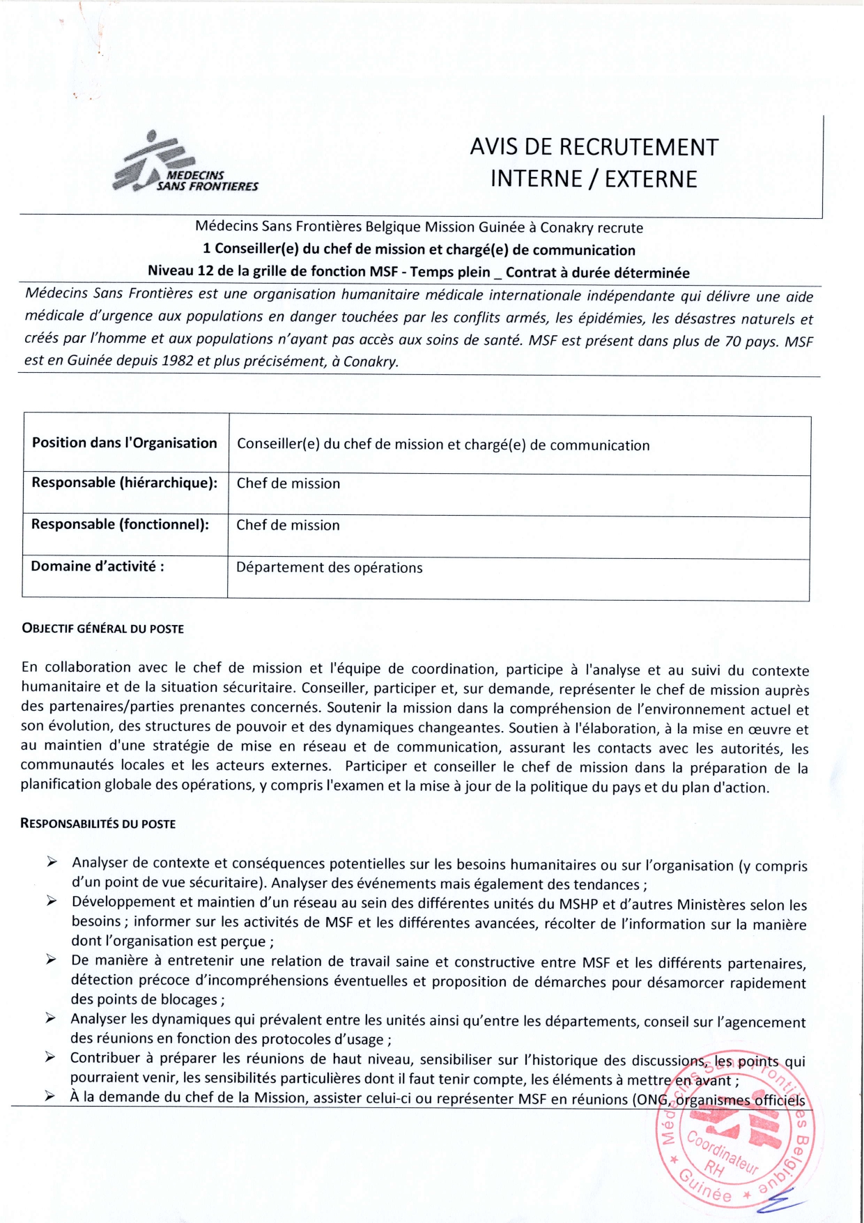 Offre d’emploi : Medecins Sans Frontière recrute un(e) Conseiller(e) du chef de mission et chargé(e) de communication Offres d'emploi By alphaleserum@gmail.com Last updated Août 23, 2024 Share Share